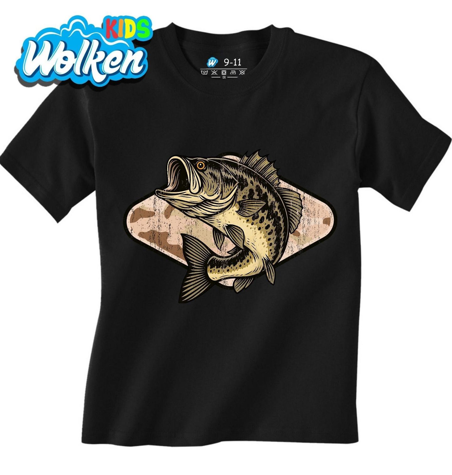 Dětské tričko Maskovaný Okounek pstruhový. Stylový motiv se siluetou mohutné ryby připomínající largemouth bass (Okounek pstruhový) je skvělou volbou pro každého rybáře, který miluje rybaření na maximum. Tato ryba je známá svou bojovností, a právě proto je vyhledávaným úlovkem sportovních rybářů po celém světě.