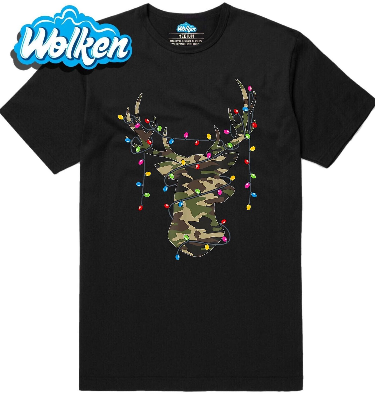 Pánské tričko Maskovaný Vánoční Jelen. Vánoce se dají oslavit i s originálním stylem! Tento motiv zachycuje siluetu majestátního jelena v maskáčovém provedení, omotaného barevnými vánočními světýlky. Perfektní pro myslivce, milovníky lesa i všechny, kdo chtějí oslavit Vánoce s humorem a nápadem.