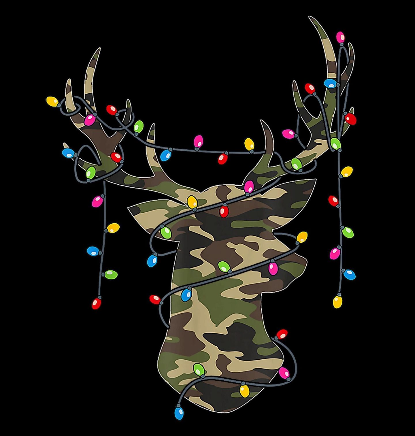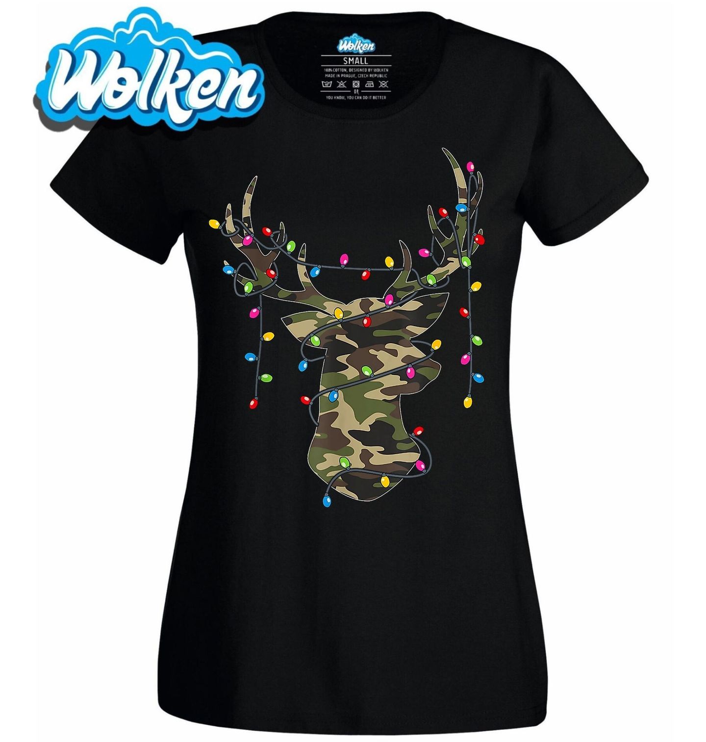 Dámské tričko Maskovaný Vánoční Jelen. Vánoce se dají oslavit i s originálním stylem! Tento motiv zachycuje siluetu majestátního jelena v maskáčovém provedení, omotaného barevnými vánočními světýlky. Perfektní pro myslivce, milovníky lesa i všechny, kdo chtějí oslavit Vánoce s humorem a nápadem.