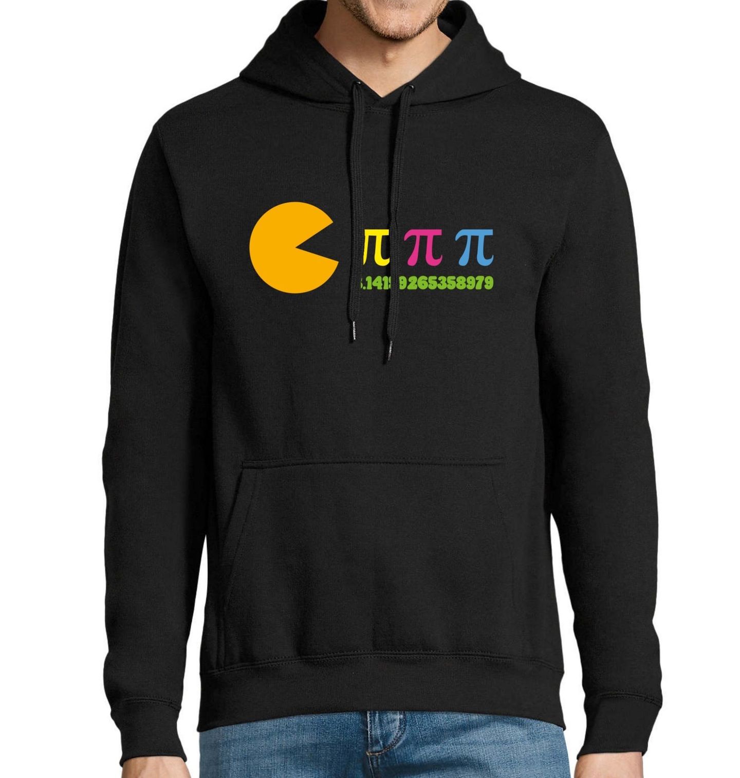 Pánská mikina Matematický Pac-Man Pí (𝝅). Zábavný motiv pro všechny milovníky matematiky, Pac-Mana a slavné konstanty pí! Ikonická postavička Pac-Mana si pochutnává na třech barevných symbolech π a pod nimi je uvedeno přesné číslo pí: 3.14159265358979. Ideální dárek pro každého matematika.