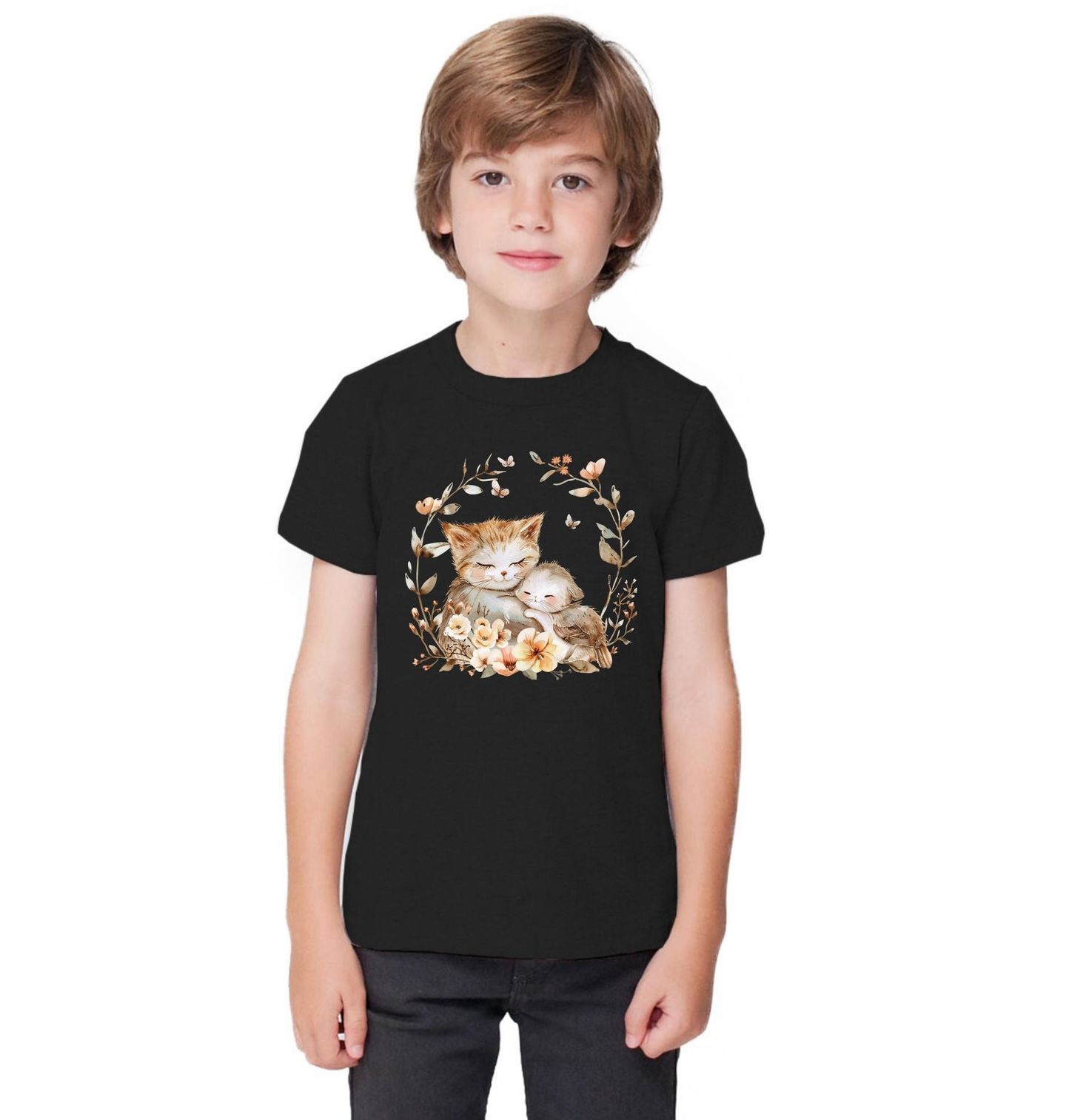 Dětské tričko Mateřská Láska Kočka a Kotě. Kočka a její mládě v něžném objetí, obklopené květinovým věncem a drobnými motýlky. Ilustrace vyzařuje klid, lásku a pocit bezpečí – ideální motiv pro všechny, kdo milují kočky a něžnou estetiku. Design je inspirovaný přírodou a rodičovskou blízkostí, díky čemuž působí hřejivě a harmonicky.