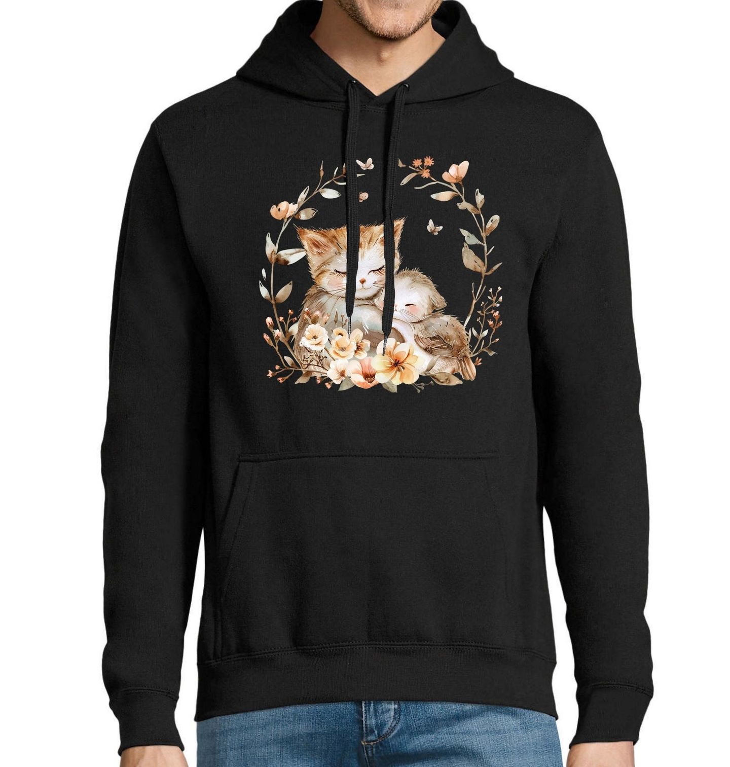 Pánská mikina Mateřská Láska Kočka a Kotě. Kočka a její mládě v něžném objetí, obklopené květinovým věncem a drobnými motýlky. Ilustrace vyzařuje klid, lásku a pocit bezpečí – ideální motiv pro všechny, kdo milují kočky a něžnou estetiku. Design je inspirovaný přírodou a rodičovskou blízkostí, díky čemuž působí hřejivě a harmonicky.