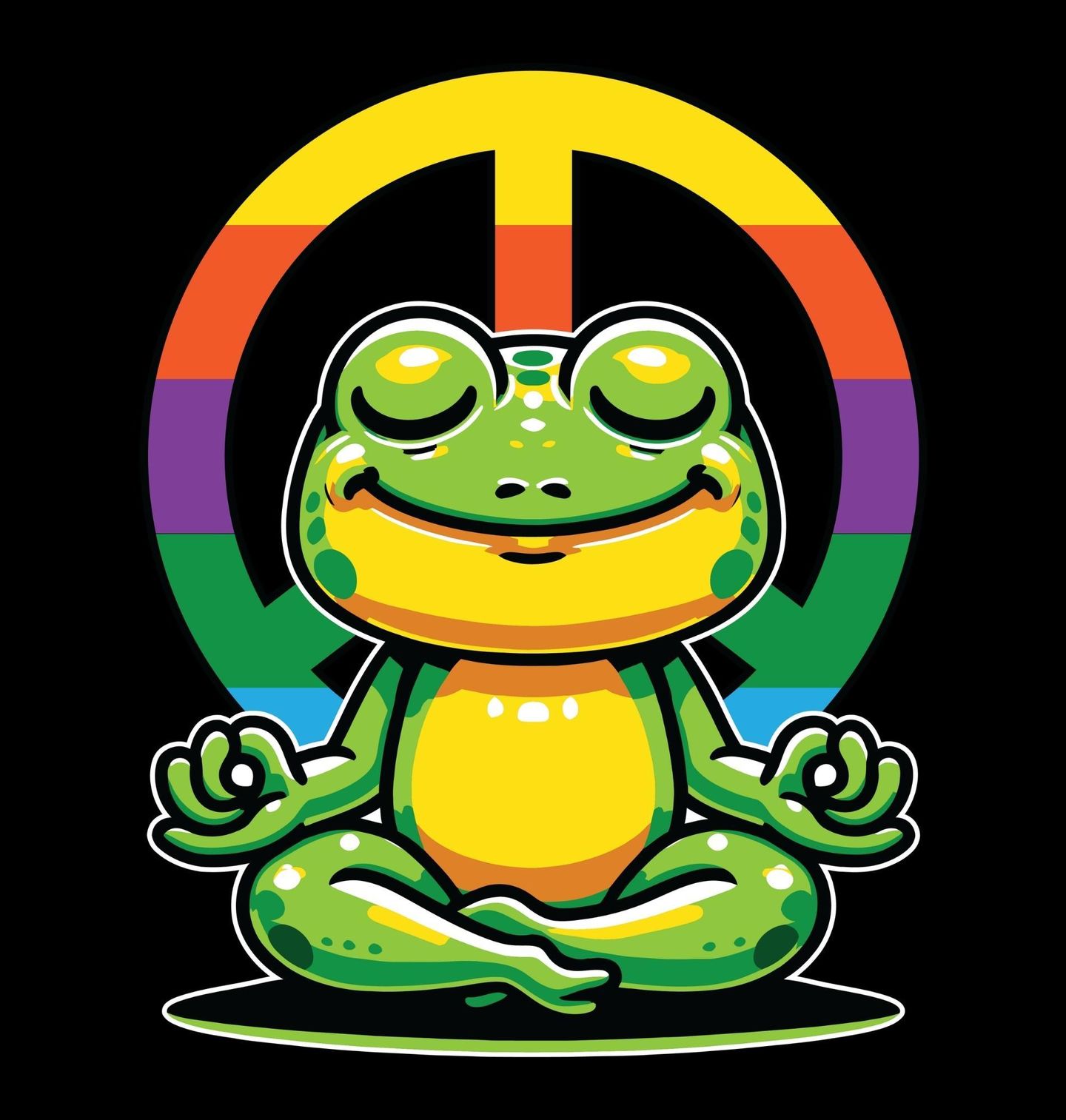 Pánská mikina Meditující Hippie Žába. Přeneste se do klidného světa harmonie s tímto stylovým motivem, kde hlavní roli hraje usměvavá žába v meditační pozici. Na pozadí ikonického symbolu pro mír v retro barvách vzniká design, který dokonale vystihuje uvolněnou atmosféru a filozofii hippie stylu.