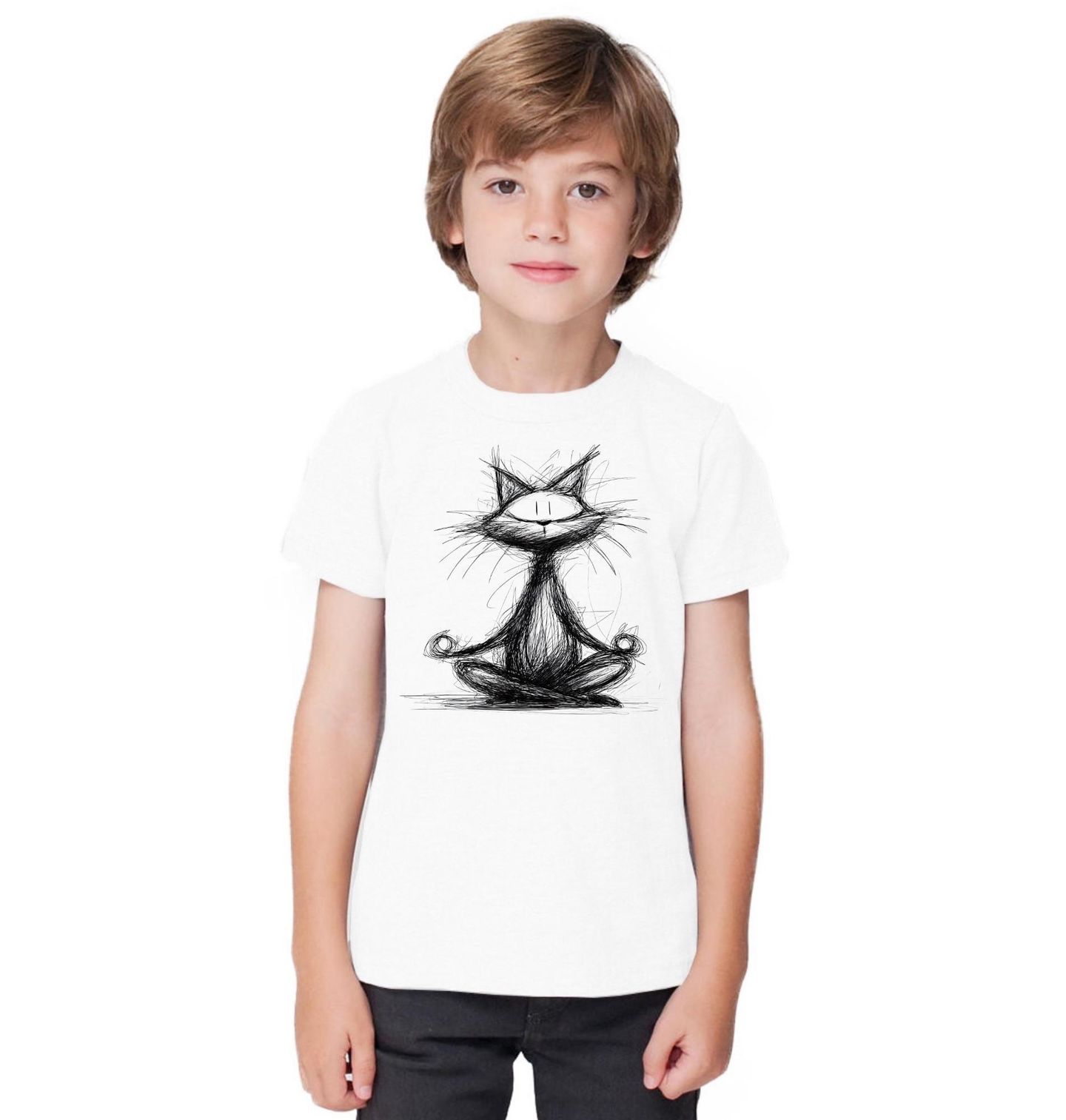 Dětské tričko Meditující Kočka Skica. Minimalistický motiv zachycuje kočku v klidné pozici meditace, vytvořený jako ručně kreslená skica plná živých, expresivních tahů. Nejde o dokonalé linie, ale o atmosféru – lehký chaos čar kontrastuje s pocitem vnitřního klidu, který meditace přináší.