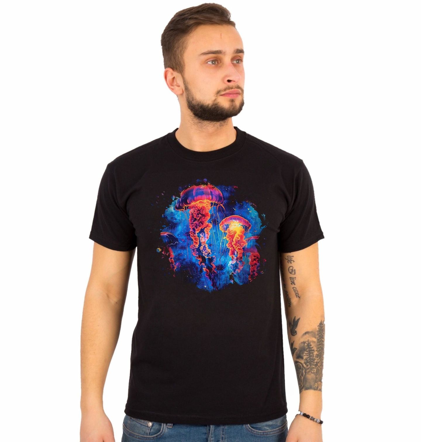 Pánské tričko Medúza Mořská kopřiva. Tento motiv zachycuje Medúzu mořská kopřiva (Chrysaora), ikonický druh z moře známý svými dlouhými chapadly a výraznými barvami. Umělecké zpracování propojuje hloubku moře s fantazií a světelným efektem, který vynikne na každém produktu.