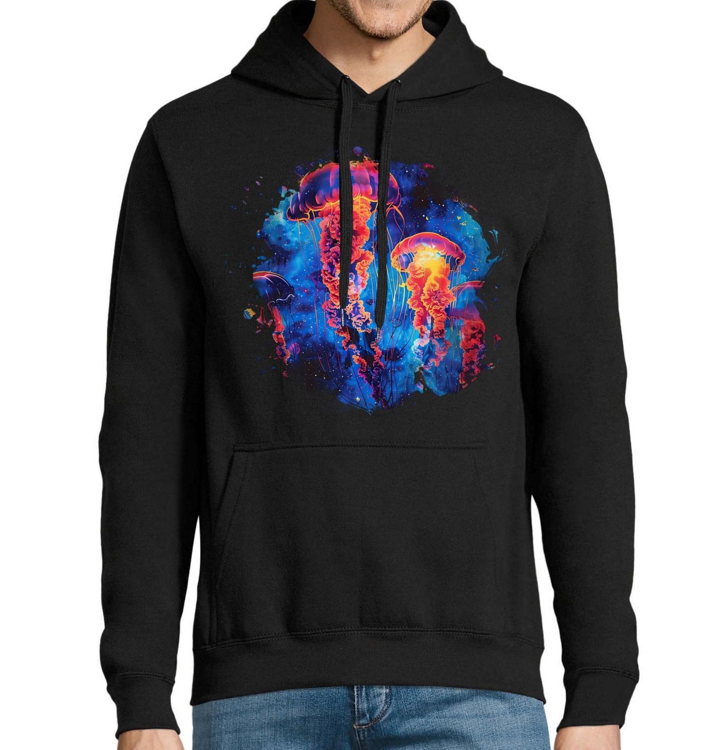 Pánská mikina Medúza Mořská kopřiva. Tento motiv zachycuje Medúzu mořská kopřiva (Chrysaora), ikonický druh z moře známý svými dlouhými chapadly a výraznými barvami. Umělecké zpracování propojuje hloubku moře s fantazií a světelným efektem, který vynikne na každém produktu.