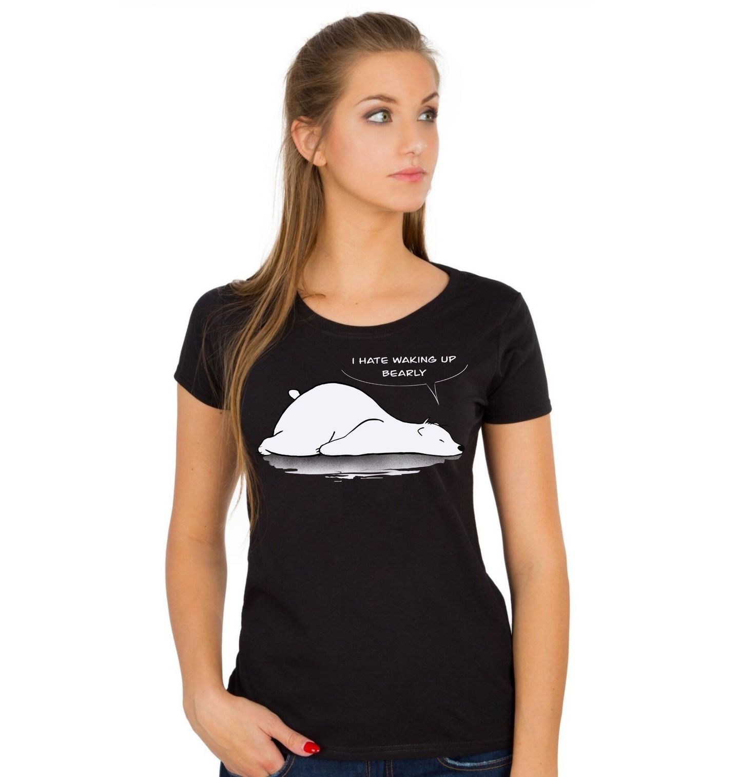 Dámské tričko Medvěd Nesnáším Ranní Vstávání. Roztomilá ilustrace s ledním medvědem obsahuje text „I HATE WAKING UP BEARLY“ (Nesnáším vstávání – slovní hříčka s ‘early’ = brzy). Perfektní pro všechny, kdo ráno bojují s budíkem a milují jednoduchý humor.