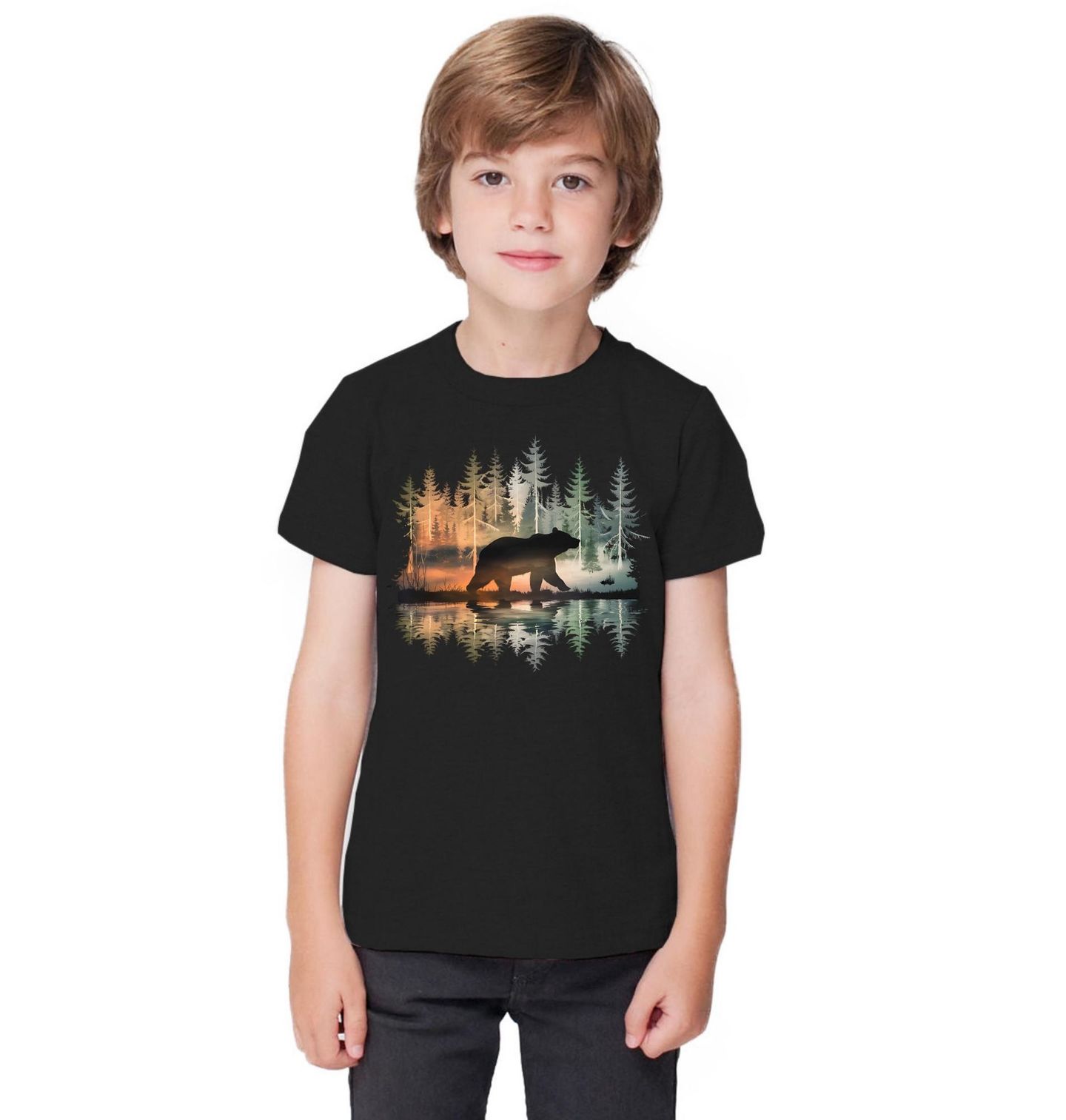 Dětské tričko Medvěd u Lesního Jezera. Nádherný přírodní motiv, ve kterém dominuje silueta medvěda procházejícího klidnou krajinou. V pozadí se rozprostírá hluboký les odrážející se v hladině jezera, zalitý jemnými barvami soumraku. Celý motiv působí harmonicky, tajemně a zároveň velmi klidně – jako pocta divoké přírodě a svobodě.