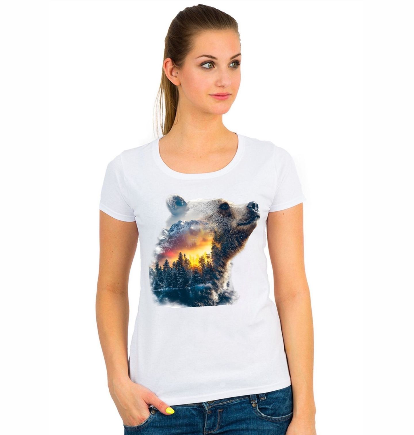 Dámské tričko Medvěd v Ohnivé Krajině. Působivý motiv spojuje majestátního medvěda s dramatickou scenérií, kde se prolíná zimní horská krajina, les a záře, kterou evokuje oheň zapadajícího slunce. Tento design vyjadřuje sílu, klid i nespoutanou energii přírody a vytváří jedinečný vizuální zážitek pro každého milovníka divoké krajiny a zvířat.