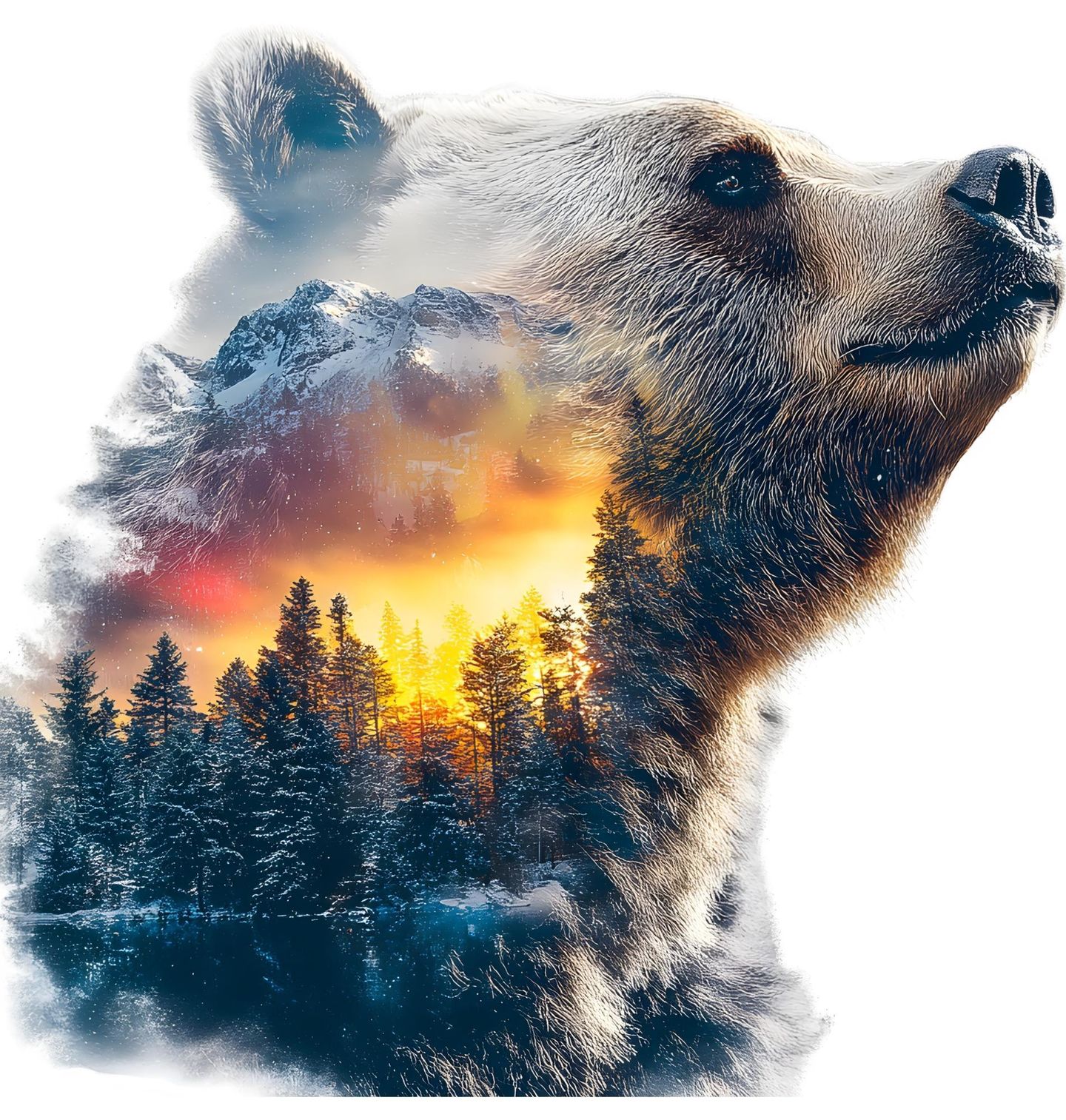 Dětské tričko Medvěd v Ohnivé Krajině. Působivý motiv spojuje majestátního medvěda s dramatickou scenérií, kde se prolíná zimní horská krajina, les a záře, kterou evokuje oheň zapadajícího slunce. Tento design vyjadřuje sílu, klid i nespoutanou energii přírody a vytváří jedinečný vizuální zážitek pro každého milovníka divoké krajiny a zvířat.