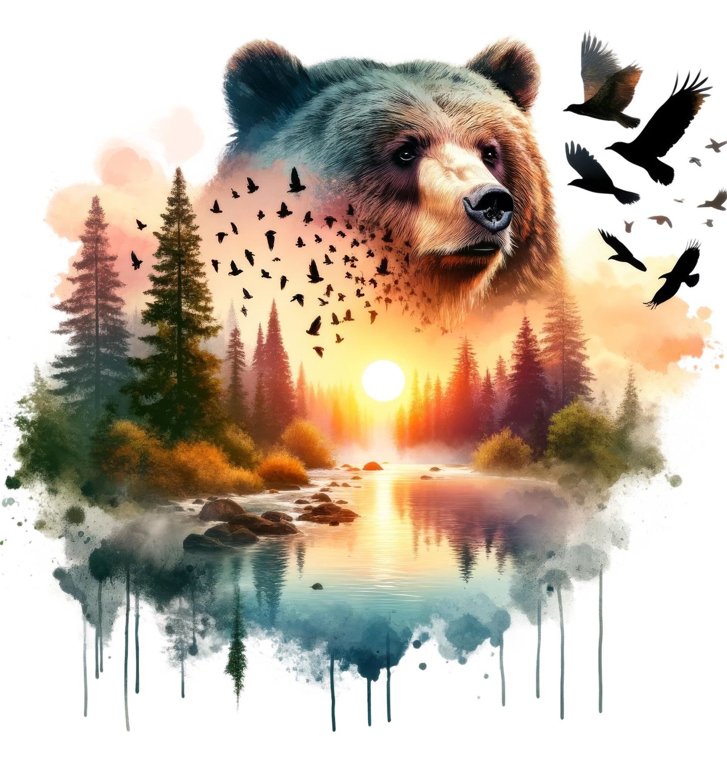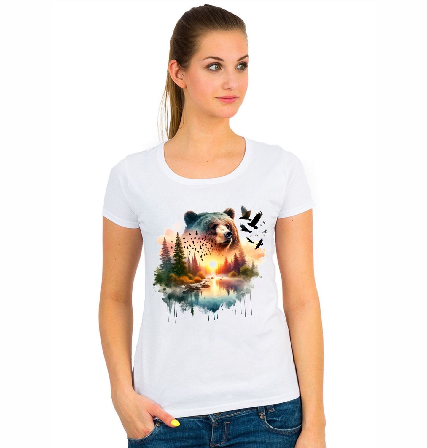Dámské tričko Medvěd v Západu Slunce. Umělecký motiv medvěda kombinovaný s přírodní scenérií. V obraze se prolíná silueta lesa, řeka, zapadající slunce a hejno ptáků. Teplé barvy západu kontrastují s tmavými stromy a vytvářejí harmonickou atmosféru divoké přírody. Tento design je ideální pro milovníky přírody, hor a divokých zvířat.