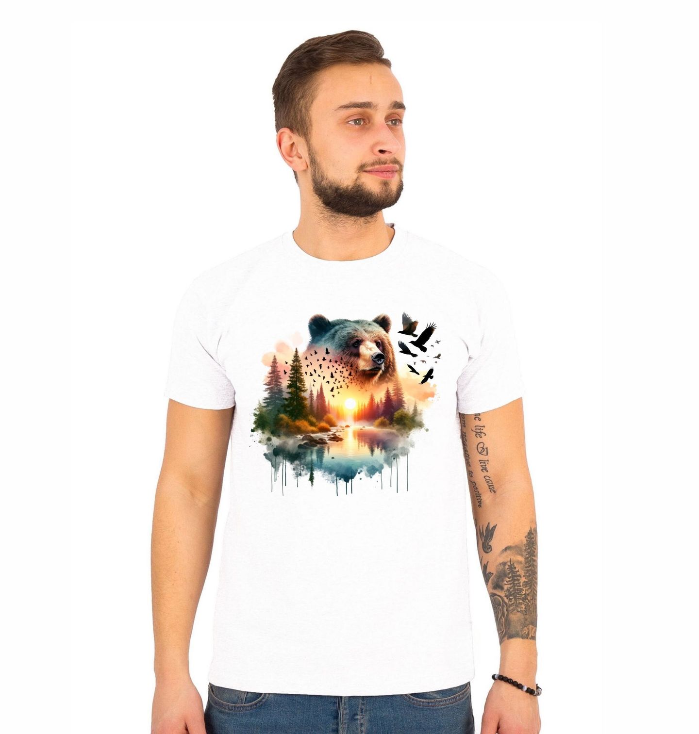 Pánské tričko Medvěd v Západu Slunce. Umělecký motiv medvěda kombinovaný s přírodní scenérií. V obraze se prolíná silueta lesa, řeka, zapadající slunce a hejno ptáků. Teplé barvy západu kontrastují s tmavými stromy a vytvářejí harmonickou atmosféru divoké přírody. Tento design je ideální pro milovníky přírody, hor a divokých zvířat.