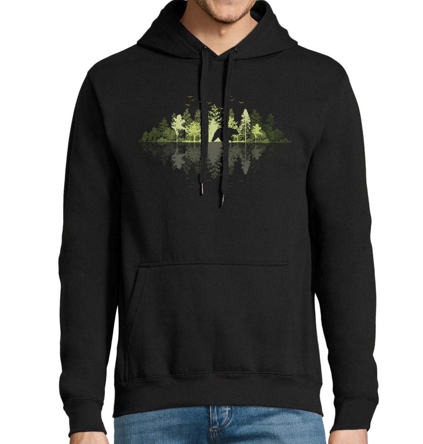 Pánská mikina Medvědí Král Lesa. Nádherný motiv siluety medvěda procházejícího klidným lesem, jehož obraz se odráží na hladině jezera. Tento originální design je ideální pro milovníky přírody, dobrodružství a volnosti. Kombinace motivu lesa a majestátního medvěda dodává tričku divoký, ale zároveň klidný charakter. Perfektní pro výlety do hor, kempování i každodenní nošení.