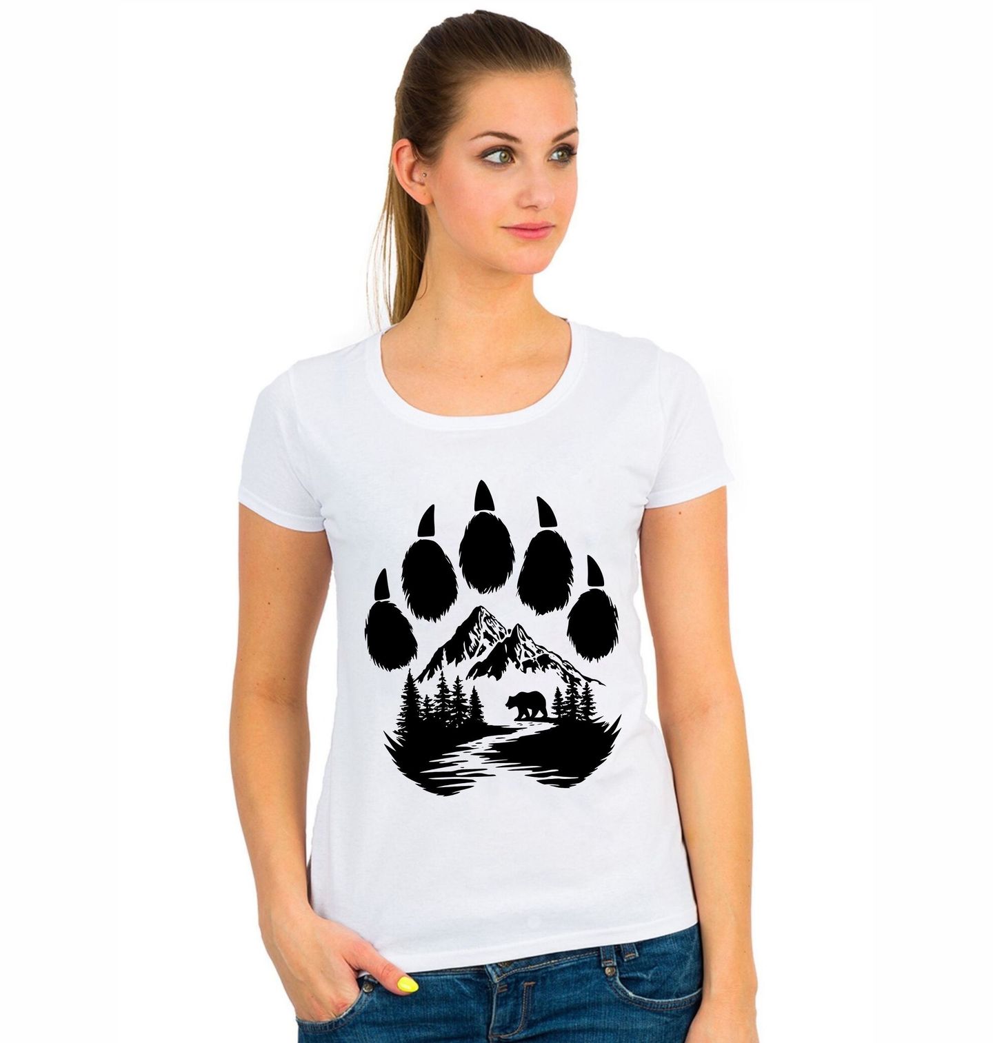 Dámské tričko Medvědí Tlapa s Krajinou. Originální design ve tvaru medvědí tlapy, uvnitř které se nachází horská krajina s lesem, řekou a malou siluetou medvěda. Motiv symbolizuje spojení zvířete s jeho přirozeným prostředím. Tento design je ideální pro outdoor nadšence, turisty a milovníky divočiny.
