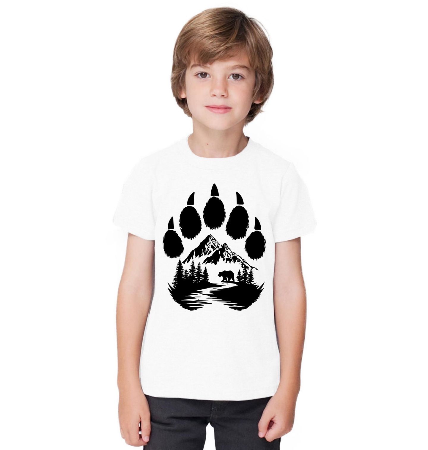 Dětské tričko Medvědí Tlapa s Krajinou. Originální design ve tvaru medvědí tlapy, uvnitř které se nachází horská krajina s lesem, řekou a malou siluetou medvěda. Motiv symbolizuje spojení zvířete s jeho přirozeným prostředím. Tento design je ideální pro outdoor nadšence, turisty a milovníky divočiny.