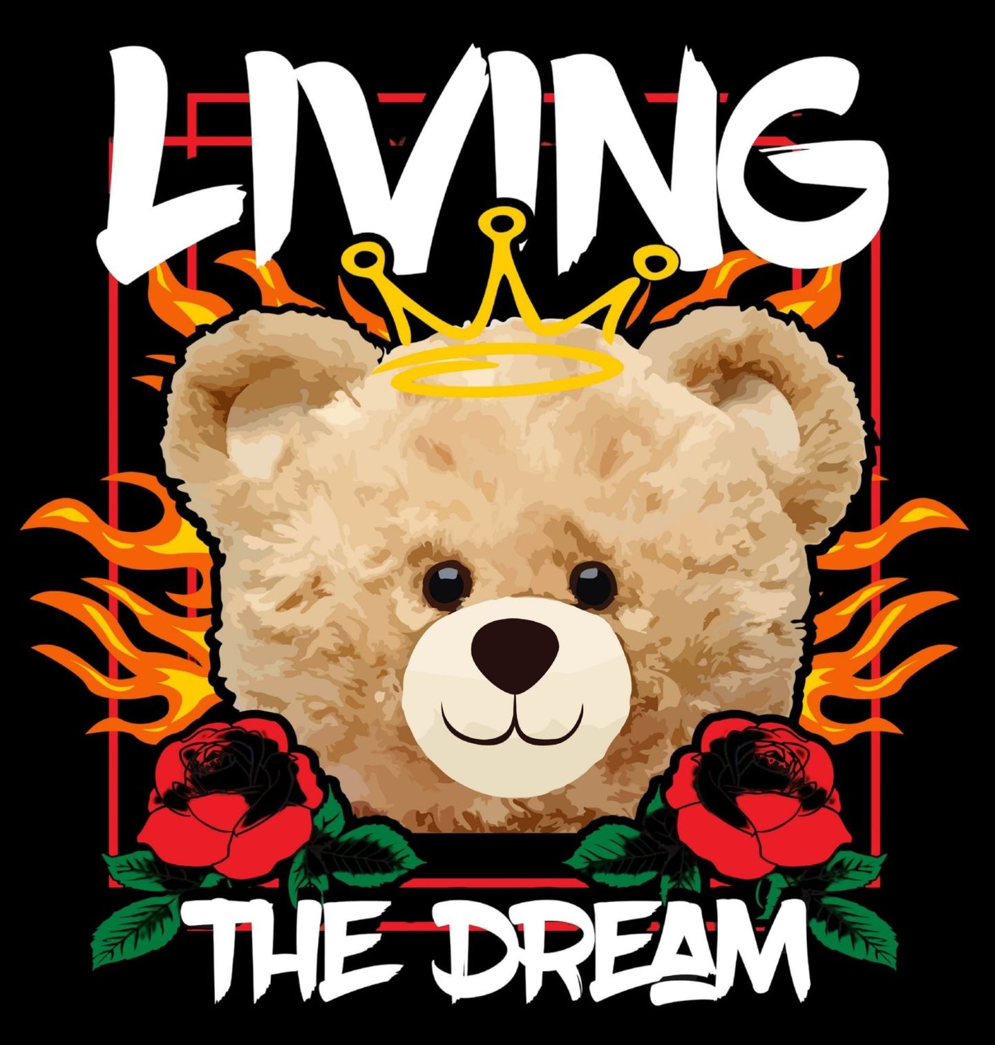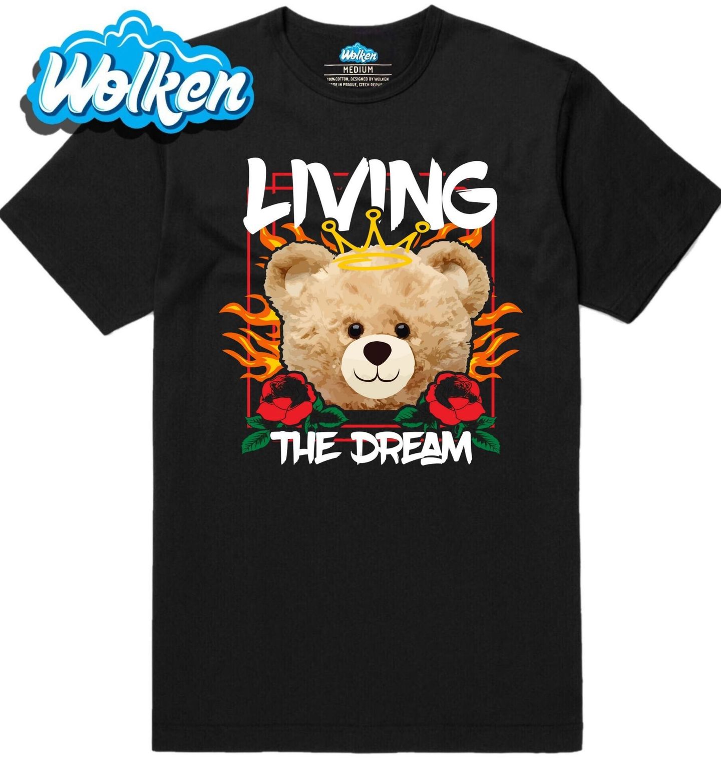 Pánské tričko Medvídek v Plamenech. Roztomilý a stylový medvěd s korunou, svatozáří a ohnivým pozadím nese jasné poselství – LIVING THE DREAM neboli „Žít sen“. Tento originální motiv spojuje roztomilost plyšového medvěda s dravým street stylem – plameny, růže a výrazný kontrast dělají z tohoto designu skvělý doplněk.