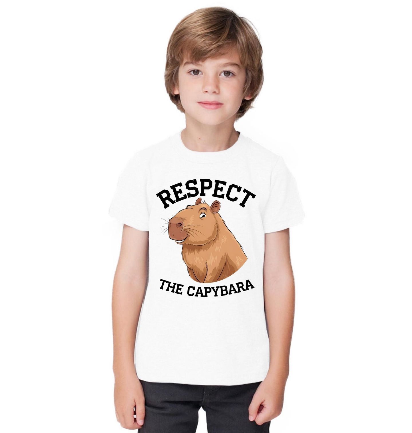Dětské tričko Měj Respekt ke Kapybaře. Tričko s motivem kapybary je ideální pro všechny milovníky zvířat, pohody a trošky ironie. Uprostřed designu je usměvavá kapybara ve vektorovém stylu s nápisem „Respect The Capybara“. Kapybara – největší hlodavec světa a zároveň neoficiální král klidu – je zde vyobrazena jako sebevědomý tvor, který si zaslouží respekt.