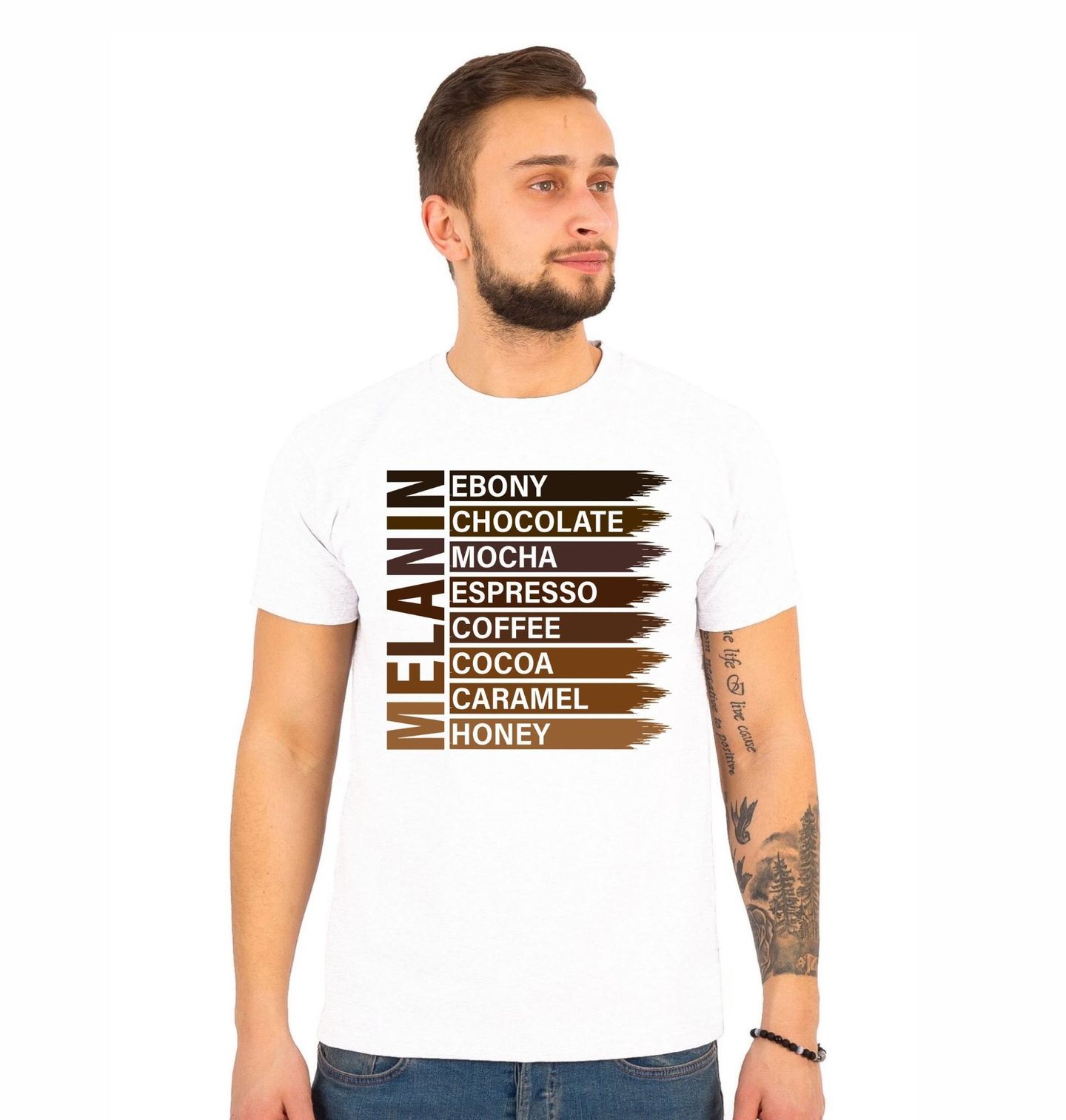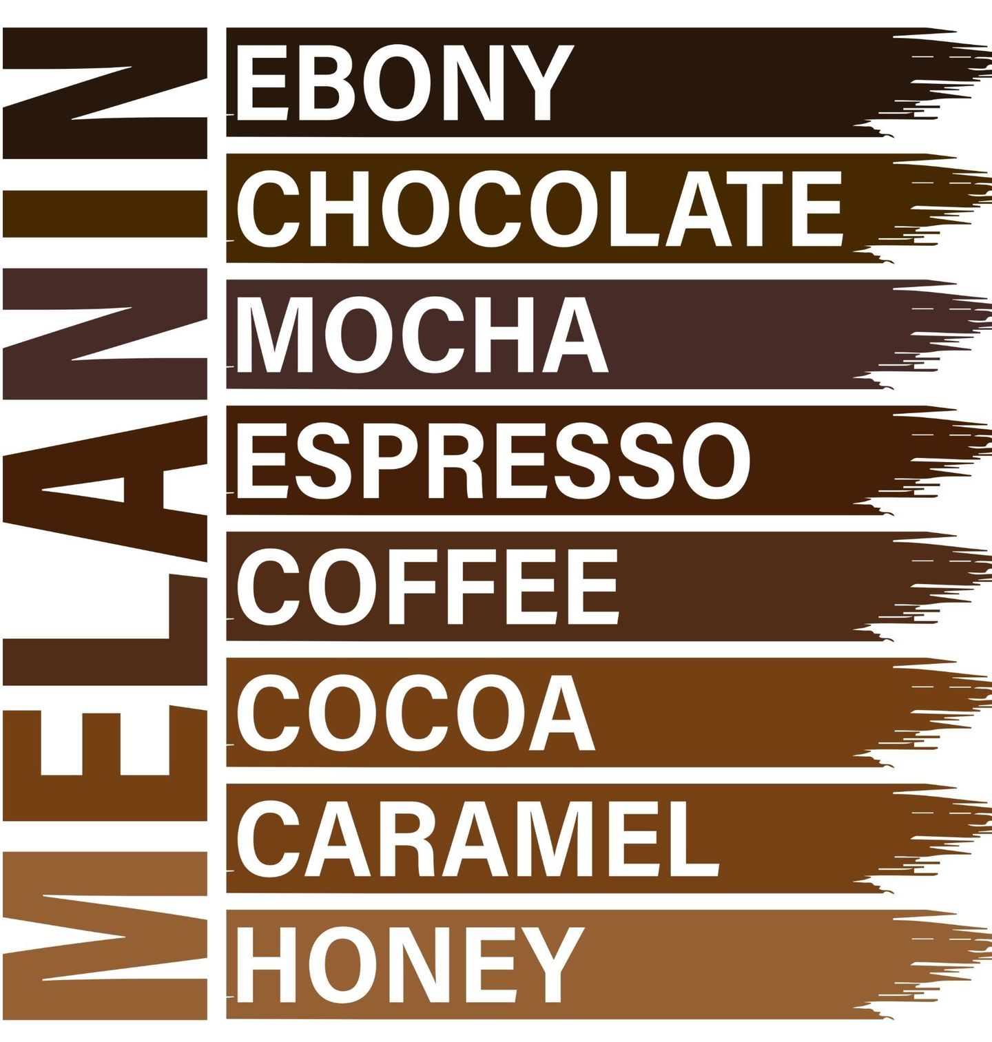 Pánské tričko Melanin od Ebony až po Honey. Stylový motiv inspirovaný chutí i barvou, kde káva a její různé podoby tvoří jedinečné hnědé spektrum barev. Od ebony přes chocolate až po honey – každý odstín odráží přirozenou krásu, kterou symbolizují melanin a jeho bohatá paleta.