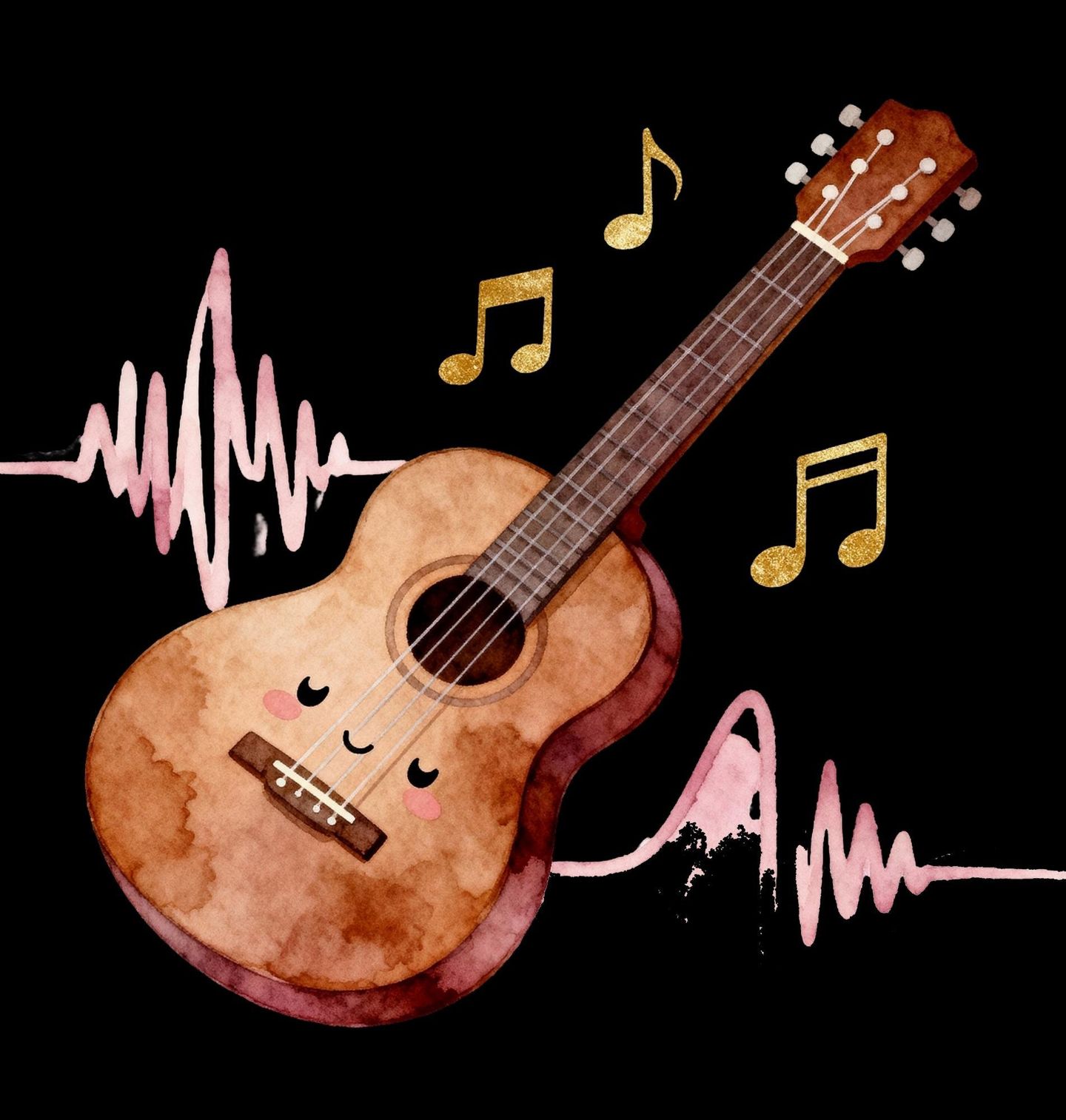 Pánské tričko Melodie Akustické Kytary. Jemný a pozitivní motiv, ve kterém hraje hlavní roli akustická kytara s roztomilým úsměvem. Kolem létají hudební noty a jemné vlnky, které připomínají melodii, rytmus a klidnou atmosféru. Design působí hravě, něžně a přináší pocit pohody — jako když si v klidu brnkáte na struny oblíbené kytary.