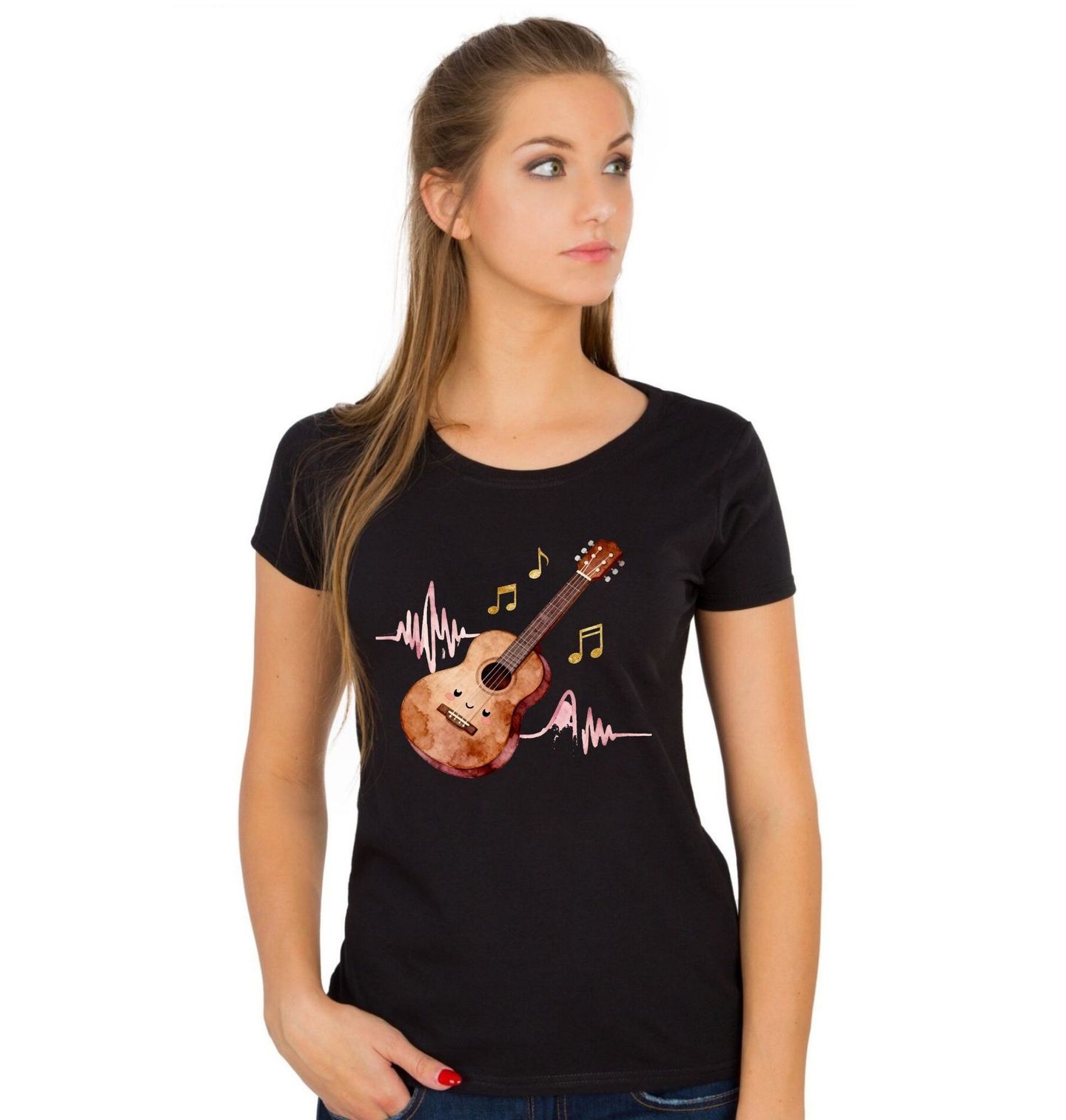 Dámské tričko Melodie Akustické Kytary. Jemný a pozitivní motiv, ve kterém hraje hlavní roli akustická kytara s roztomilým úsměvem. Kolem létají hudební noty a jemné vlnky, které připomínají melodii, rytmus a klidnou atmosféru. Design působí hravě, něžně a přináší pocit pohody — jako když si v klidu brnkáte na struny oblíbené kytary.