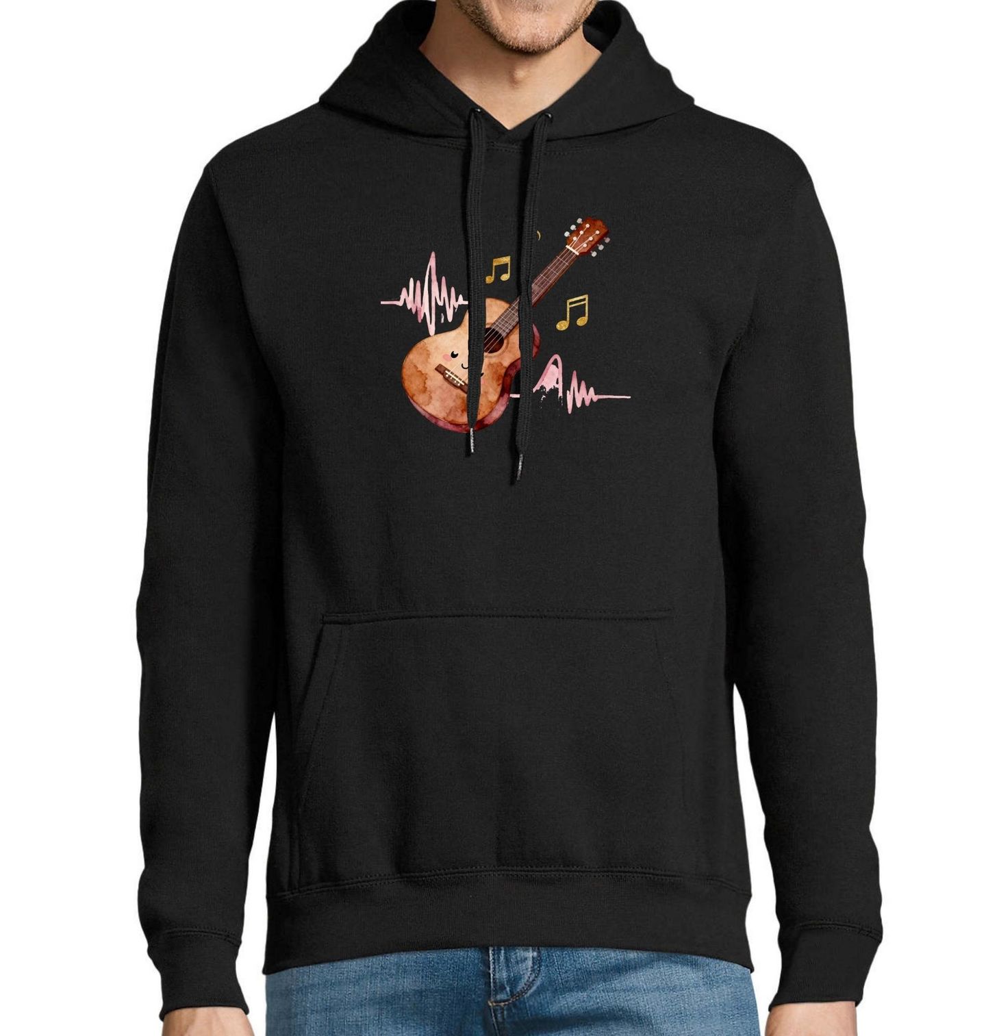 Pánská mikina Melodie Akustické Kytary. Jemný a pozitivní motiv, ve kterém hraje hlavní roli akustická kytara s roztomilým úsměvem. Kolem létají hudební noty a jemné vlnky, které připomínají melodii, rytmus a klidnou atmosféru. Design působí hravě, něžně a přináší pocit pohody — jako když si v klidu brnkáte na struny oblíbené kytary.
