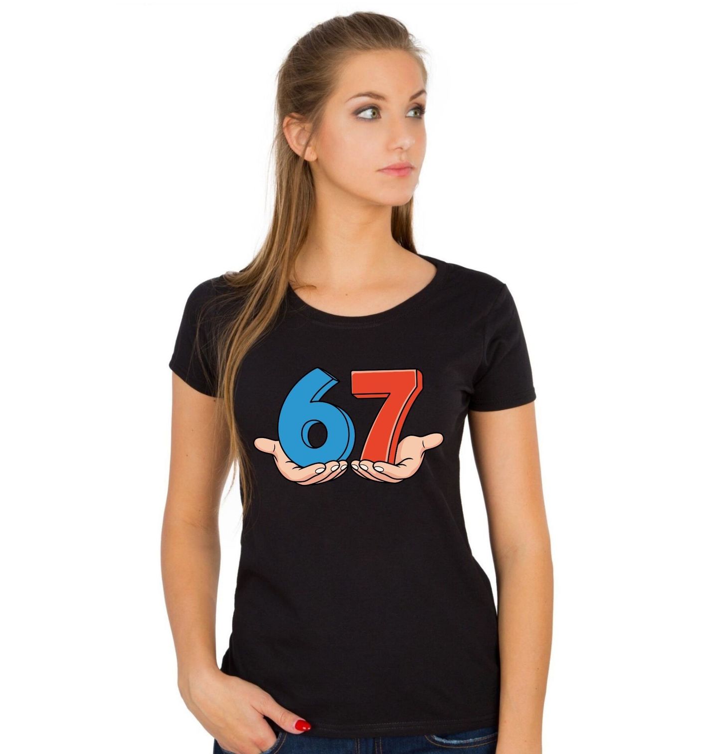 Dámské tričko Meme 67 na Dlani Six Seven. Na motivu je velké číslo 67, kde modrá šestka a červená sedmička leží v otevřených dlaních. Celý design působí hravě a odlehčeně jako moderní meme a zároveň odkazuje na výraz six seven. Jednoduchý, výrazný motiv pro všechny fanoušky čísla 67.