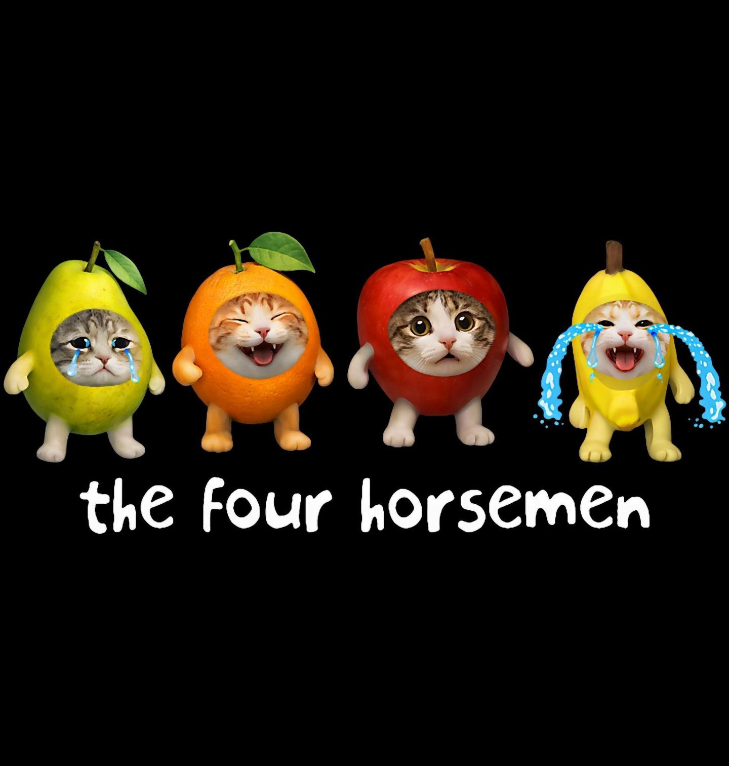 Dětské tričko Meme Kočky jako Čtyři Jezdci Apokalypsy. Humorný motiv ukazuje, jak kočky převlečené za ovoce představují parodii na známý symbol apokalypsy. Nápis „the four horsemen“ znamená „čtyři jezdci apokalypsy“. Každá kočka v kostýmu ovoce zobrazuje jinou emoci a vytváří zábavný kontrast mezi dramatickým názvem a roztomilým vzhledem.