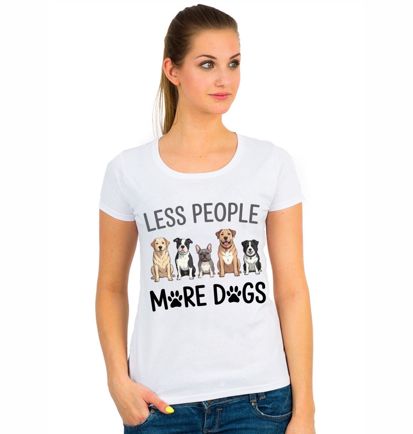 Dámské tričko Méně Lidí, více Psů. Roztomilý motiv několika různých psů sedících vedle sebe – od labradora po francouzského buldočka. Design doprovází hravý text s otisky tlapek. Text na obrázku: „LESS PEOPLE MORE DOGS“ (Méně lidí, více psů). Vhodný dárek pro všechny milovníky psů.