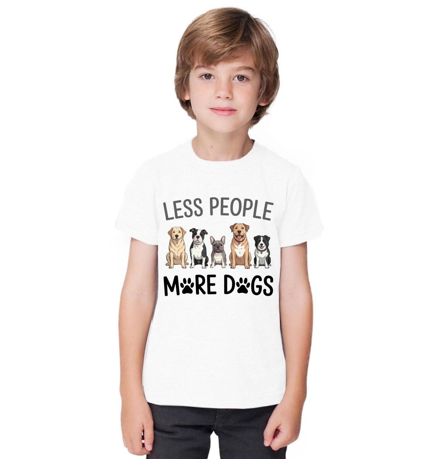 Dětské tričko Méně Lidí, více Psů. Roztomilý motiv několika různých psů sedících vedle sebe – od labradora po francouzského buldočka. Design doprovází hravý text s otisky tlapek. Text na obrázku: „LESS PEOPLE MORE DOGS“ (Méně lidí, více psů). Vhodný dárek pro všechny milovníky psů.