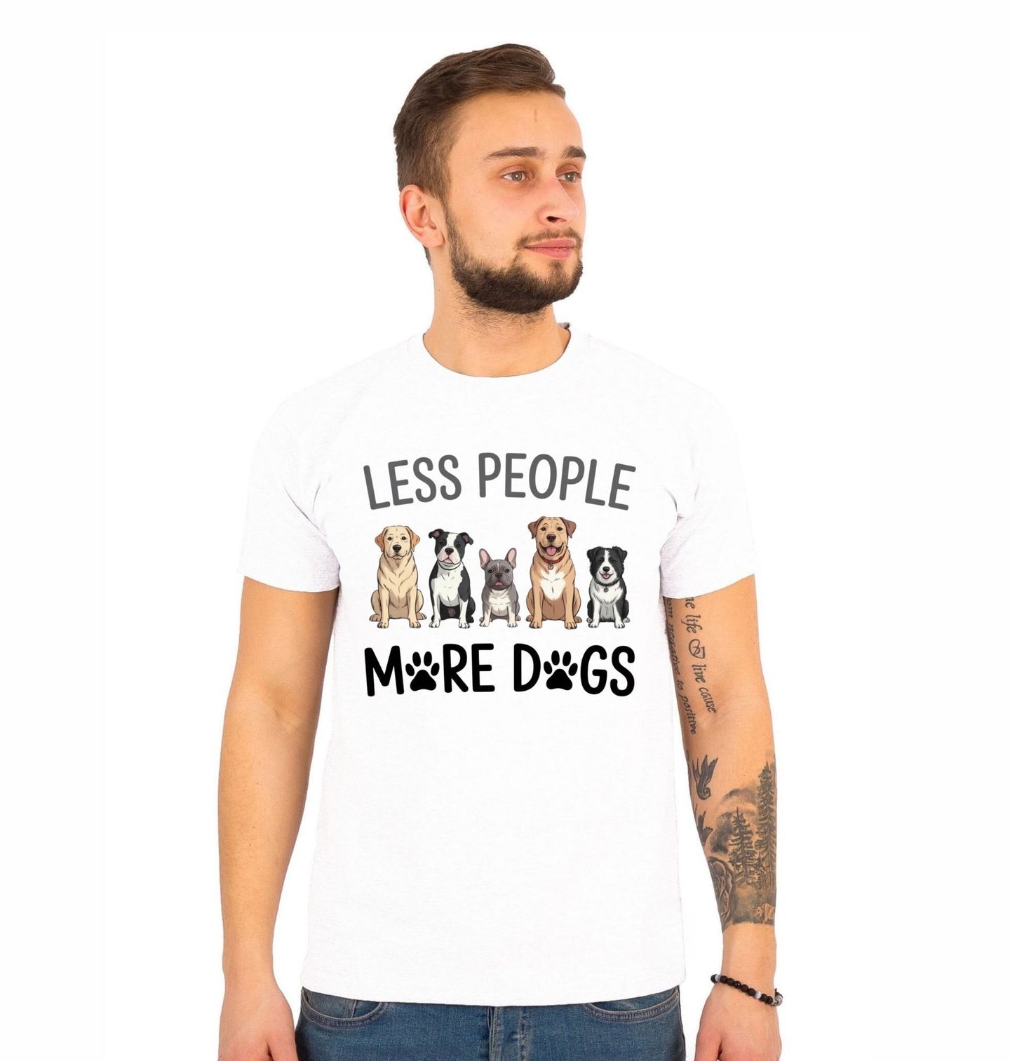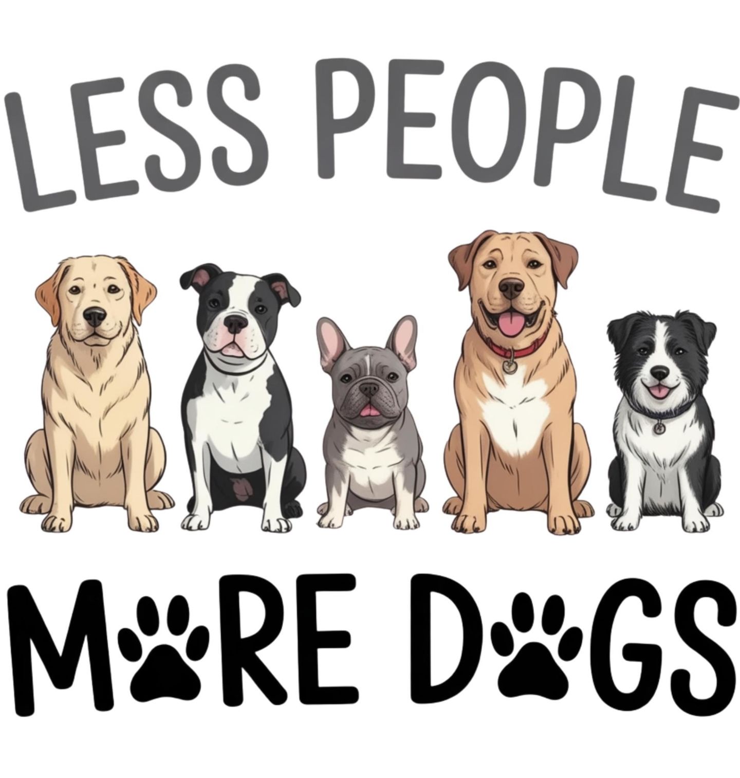 Pánské tričko Méně Lidí, více Psů. Roztomilý motiv několika různých psů sedících vedle sebe – od labradora po francouzského buldočka. Design doprovází hravý text s otisky tlapek. Text na obrázku: „LESS PEOPLE MORE DOGS“ (Méně lidí, více psů). Vhodný dárek pro všechny milovníky psů.