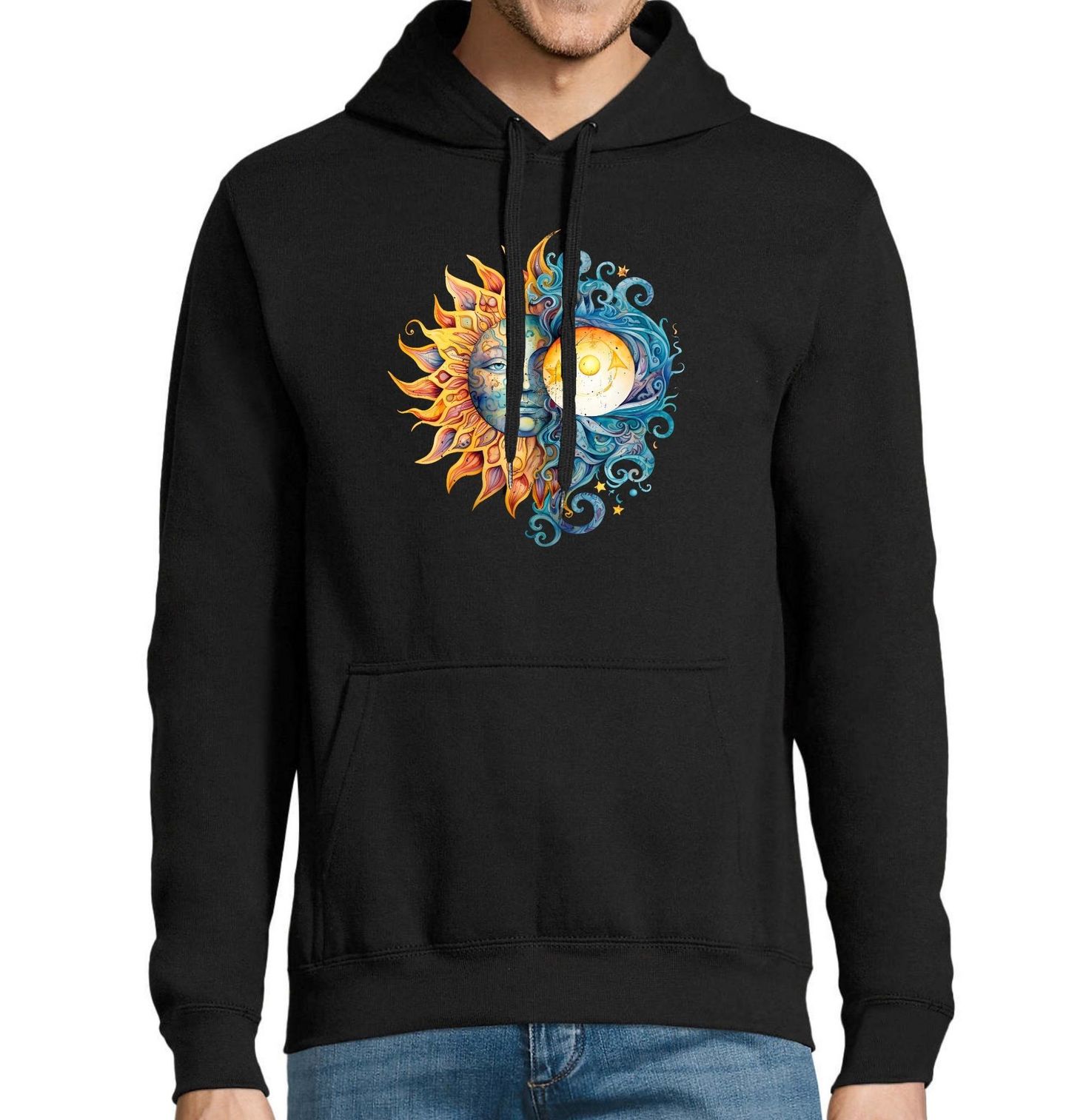 Pánská mikina Měsíc a Slunce Dvě Tváře Oblohy. Na motivu se nachází detailně ilustrovaná polovina slunce a polovina měsíce, spojené v jeden harmonický celek. Slunce září zlatými paprsky, zatímco měsíc je obklopen vířícími nočními vlnami a hvězdami. Oba elementy mají lidské rysy, jako by symbolizovaly dvě stránky naší vlastní osobnosti – světlo a tmu, den a noc.
