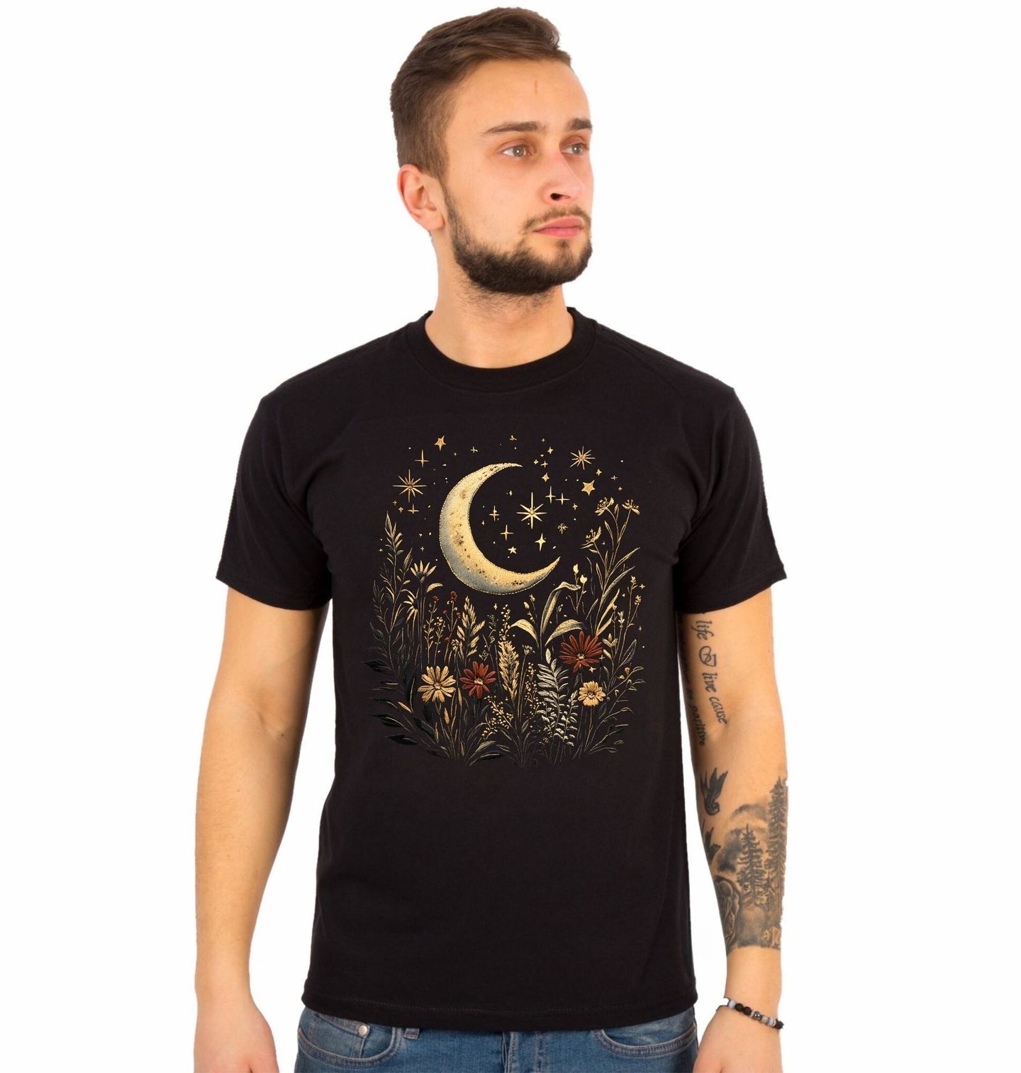 Pánské tričko Měsíc nad Květinovým Polem. Elegantní a klidný motiv, kde květiny jemně vystupují z temného pozadí a vytvářejí harmonickou kompozici inspirovanou přírodou. Nad nimi září tichý měsíc obklopený hvězdami, který dodává celé scéně magickou atmosféru. Tento design propojuje květiny, pole a měsíc do poetického obrazu plného klidu, krásy a nočního kouzla.