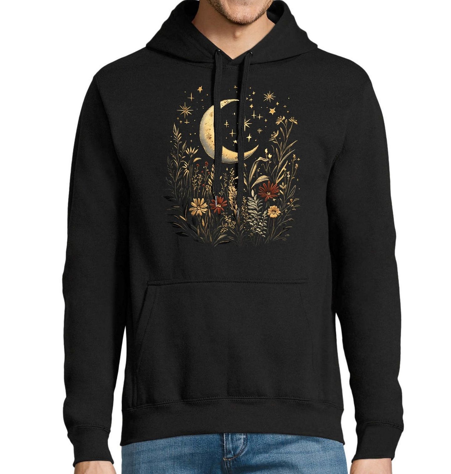 Pánská mikina Měsíc nad Květinovým Polem. Elegantní a klidný motiv, kde květiny jemně vystupují z temného pozadí a vytvářejí harmonickou kompozici inspirovanou přírodou. Nad nimi září tichý měsíc obklopený hvězdami, který dodává celé scéně magickou atmosféru. Tento design propojuje květiny, pole a měsíc do poetického obrazu plného klidu, krásy a nočního kouzla.