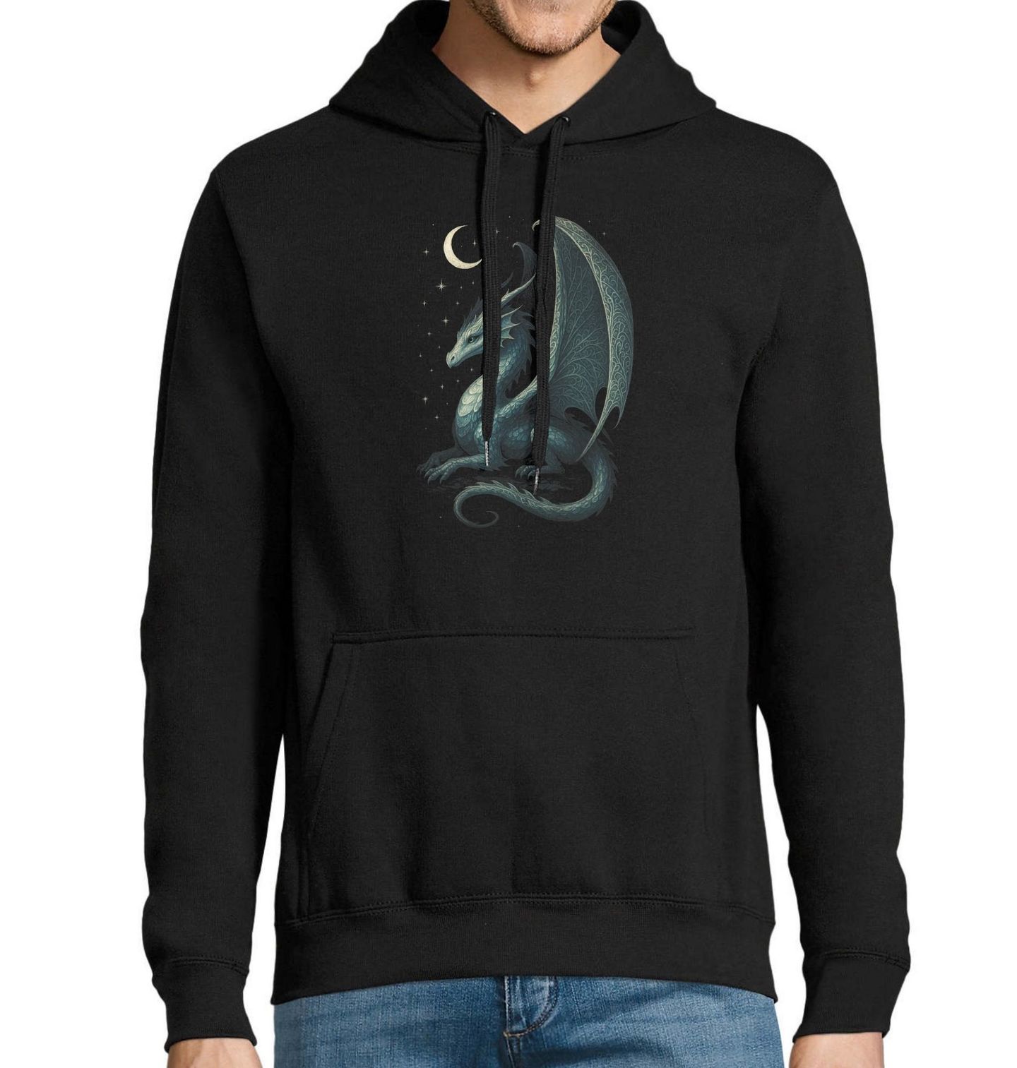 Pánská mikina Měsíční Drak. Majestátný drak odpočívá pod svitem měsíce a hvězd. Detailní umělecké zpracování zachycuje každý šupinatý detail i ladné křídlo, které se třpytí ve stříbrném světle. Tento motiv spojuje kouzlo noční oblohy a sílu legendárního tvora – ideální pro milovníky fantasy, mytologie a mystických příběhů.