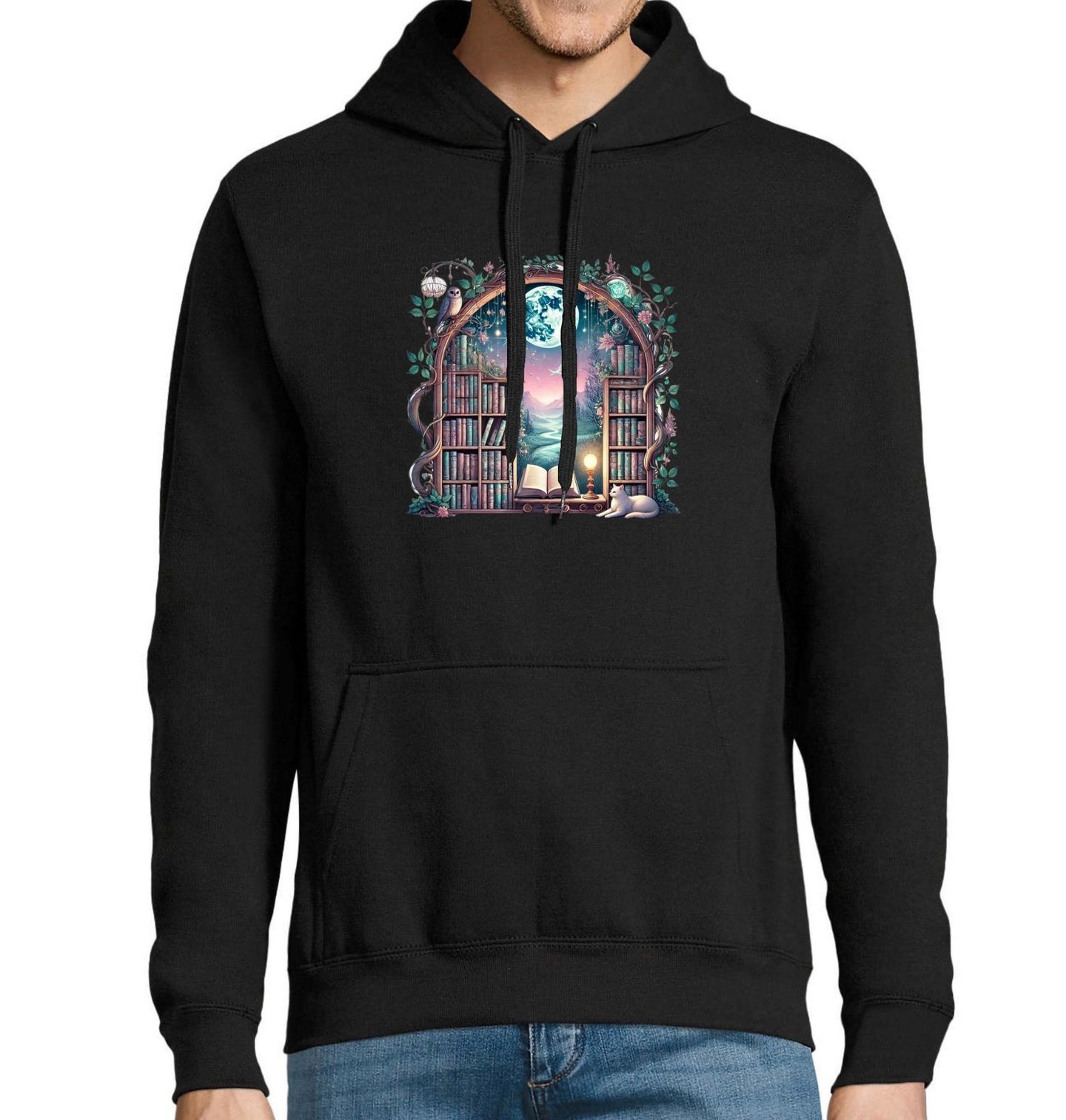 Pánská mikina Měsíční knihovna kouzel. Vstupte do světa magie s tímto kouzelným tričkem, které spojuje tajemnou knihovnu, svět fantasy a klidnou sílu měsíčního světla. Motiv zobrazuje otevřenou knihu uprostřed pohádkové knihovny, za níž se otevírá cesta do snové krajiny. Na scéně nechybí ani bílá kočka – strážkyně tajemství.