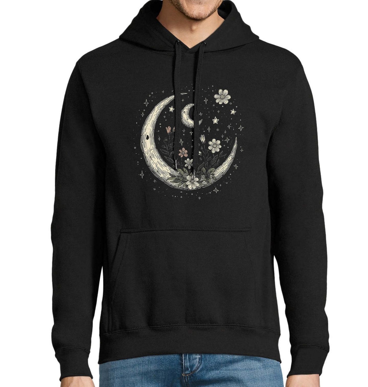 Pánská mikina Měsíční Květiny. Objevte kouzlo přírody a noční oblohy s tímto magickým tričkem Měsíční květy. Romantický design propojuje květiny s elegantním měsícem uprostřed hvězdné noci, a vytváří tak harmonický motiv plný klidu, krásy a tajemna. Ideální pro milovníky estetiky přírody i snové symboliky. Stylové tričko pro každého, kdo miluje květiny, měsíc a chce nosit trochu poezie i ve dne.