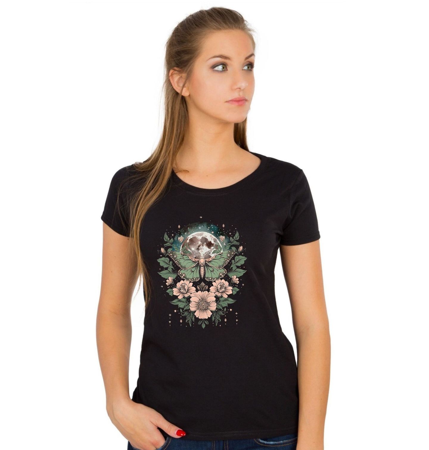 Dámské tričko Měsíční Můra mezi Květiny. Tento kouzelný design propojuje přírodní eleganci a jemnou mystiku. V popředí dominuje nádherná můra s roztaženými křídly, obklopená bohatými květinami v jemných pastelových tónech. V pozadí září měsíc, který motivu dodává snovou atmosféru noční zahrady plné ticha, hvězd a tajemství.