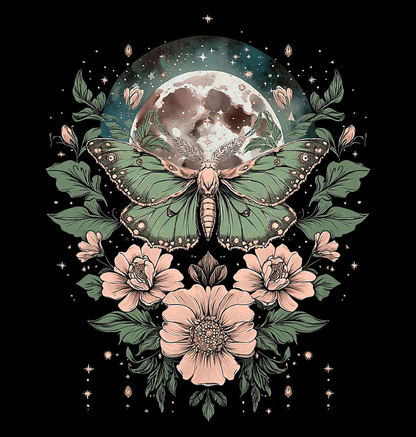 Pánská mikina Měsíční Můra mezi Květiny. Tento kouzelný design propojuje přírodní eleganci a jemnou mystiku. V popředí dominuje nádherná můra s roztaženými křídly, obklopená bohatými květinami v jemných pastelových tónech. V pozadí září měsíc, který motivu dodává snovou atmosféru noční zahrady plné ticha, hvězd a tajemství.