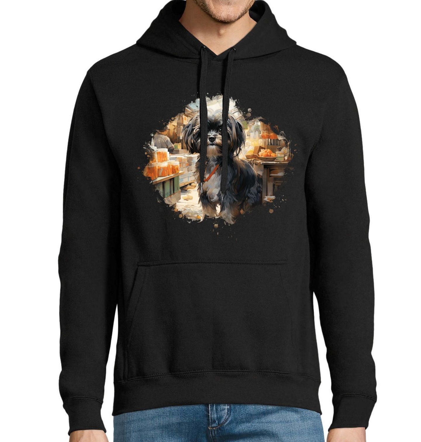Pánská mikina Městský Shih-tzu. Tenhle pes nevypadá, že by něco řešil… ale řeší všechno. Shih-tzu stojí uprostřed ruchu, kouká přímo do objektivu a dává jasně najevo, že má situaci pod kontrolou. Každý pejskař ví, že tihle malí chlupáči mají zvláštní talent vypadat důležitě i ve chvíli, kdy jen čekají, jestli náhodou něco neupadne na zem. Motiv kombinuje městský vibe, psí eleganci a jemný humor.