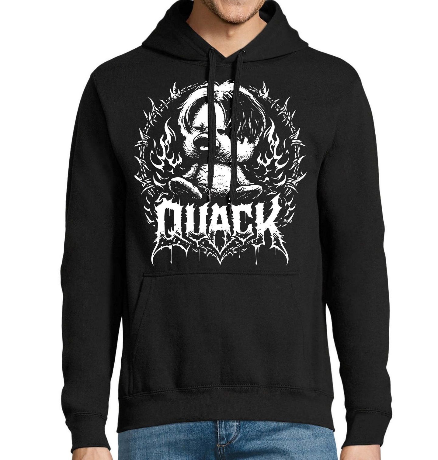 Pánská mikina Metalová Kachna Quack. Originální design kombinuje roztomilou kachnu s gotickým stylem a nápisem „QUACK“, což je zvuk, který kachna vydává (kvákání). Kontrast mezi temnou estetikou a humorným motivem vytváří jedinečný vizuální styl vhodný pro fanoušky netradičních a lehce ironických designů.