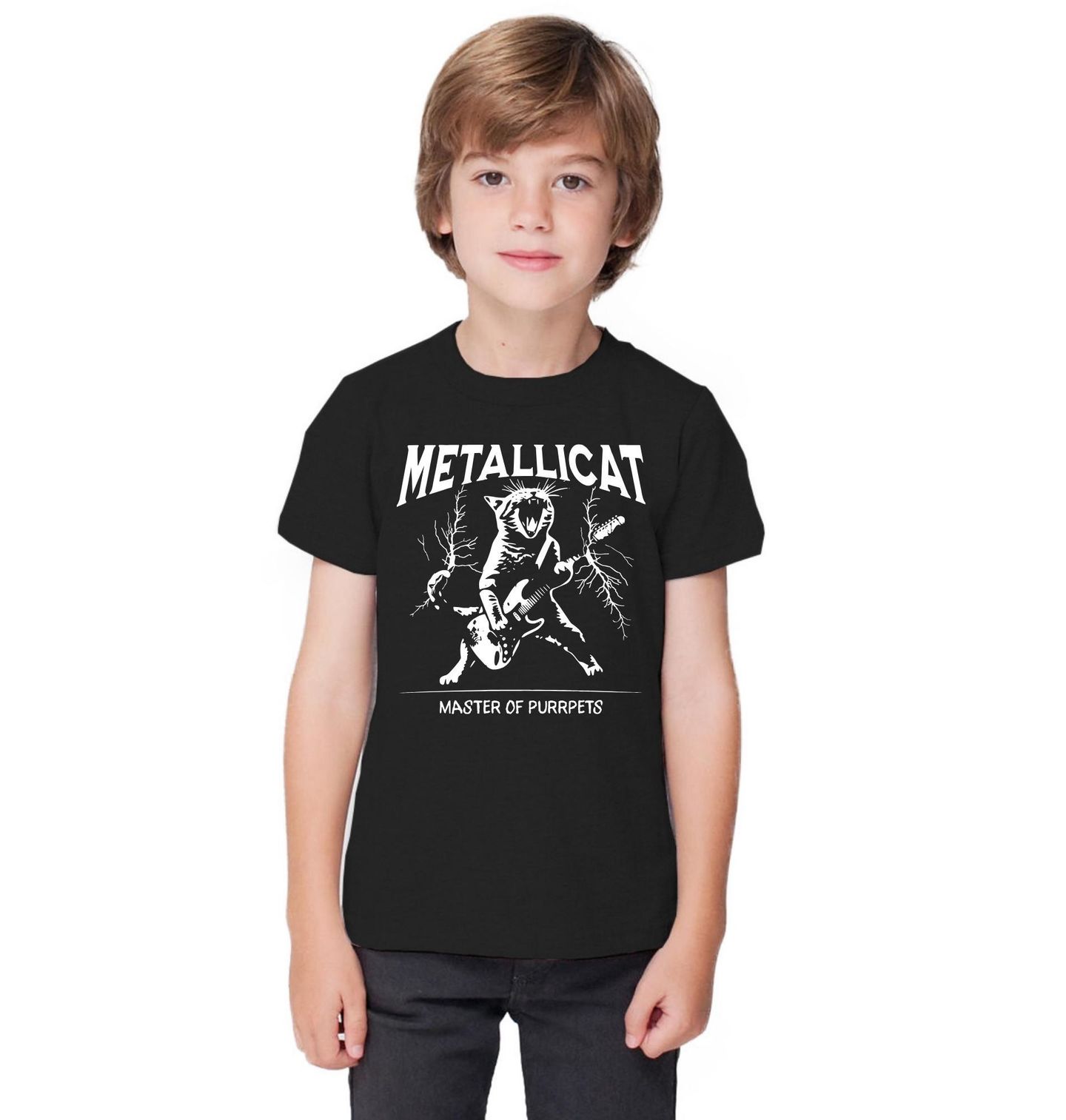 Dětské tričko Metalová Kočka Metallicat. Stylový design s rockovou kočkou a textem „Metallicat – Master of Purrpets“, což je hravý kočičí překlad názvu skladby „Master of Puppets“. Tento design potěší milovníky hudby, koček a tvrdého stylu v jedinečném provedení.