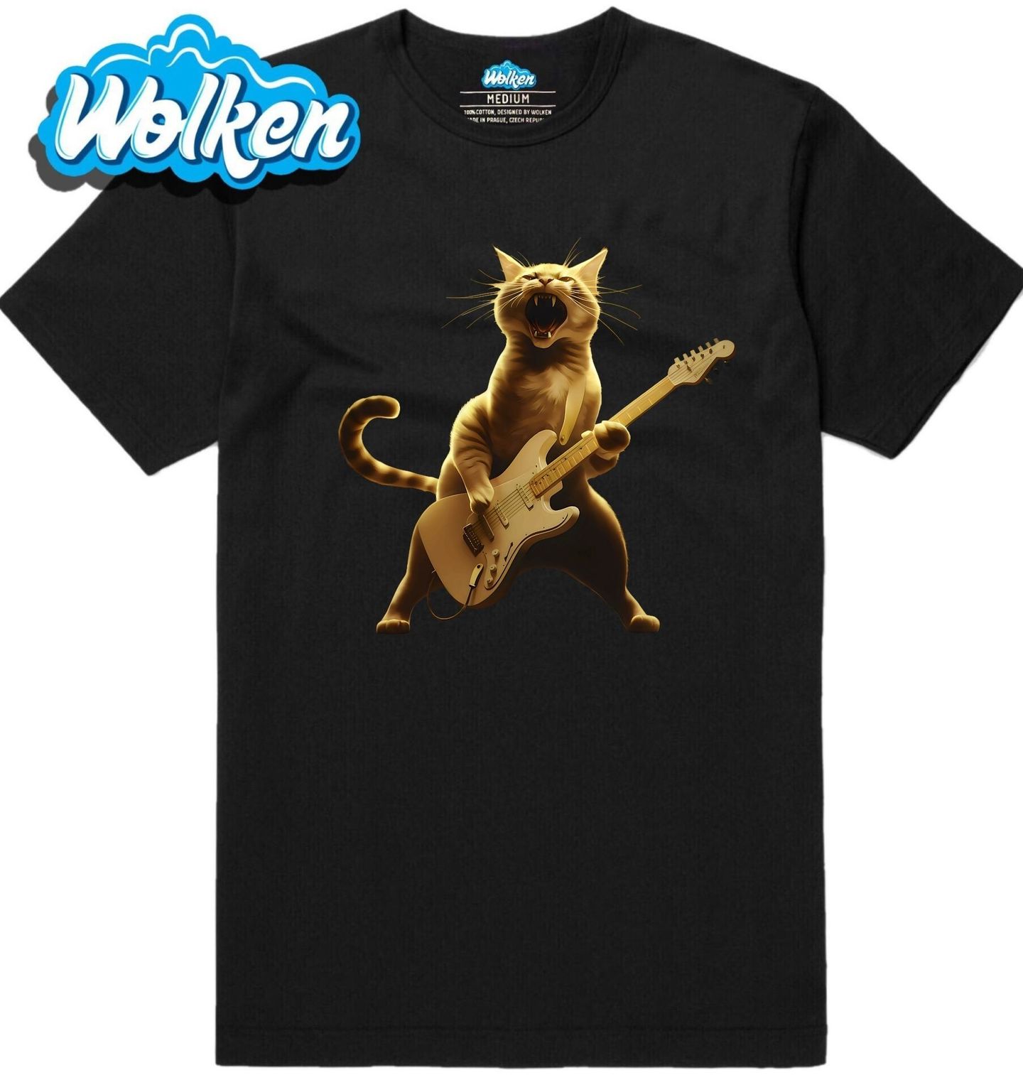 Pánské tričko Metalová Kočka s Kytarou. Tahle kočka vám ukáže, jak vypadá pořádný rock! Motiv kočka a kytara spojuje dravou energii hudby s divokým šarmem zvířecího světa. Kočka hraje na elektrickou kytaru s takovým nasazením, že to připomíná koncert ve stylu těch největších rockových legend.