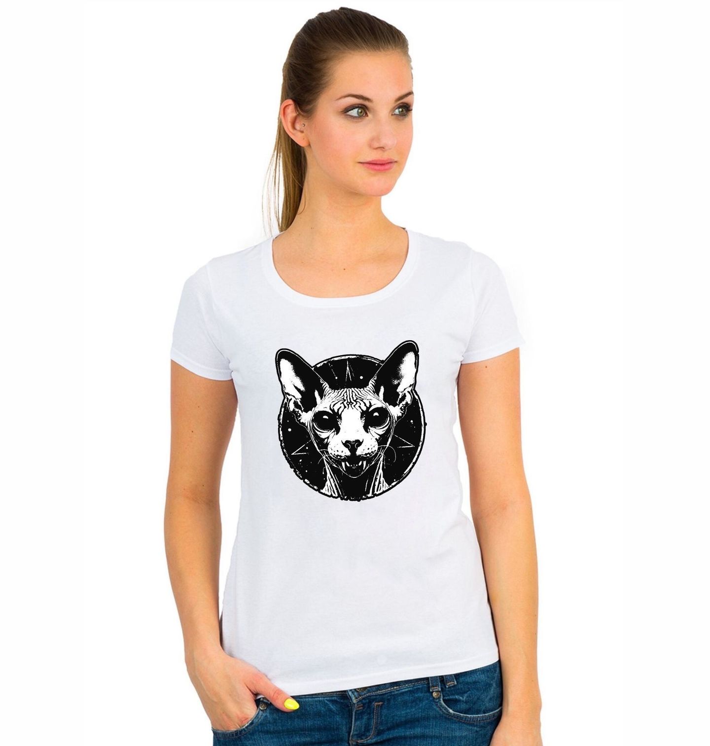 Dámské tričko Metalová Kočka Sphynx. Tento výrazný metalový motiv zobrazuje bezsrstou kočku Sphynx v temném, syrovém a nekompromisním stylu. Ostré linie, silný kontrast černé a bílé a intenzivní pohled vytvářejí obraz, který dokonale zapadá do světa metalové estetiky, temné grafiky a undergroundové kultury.