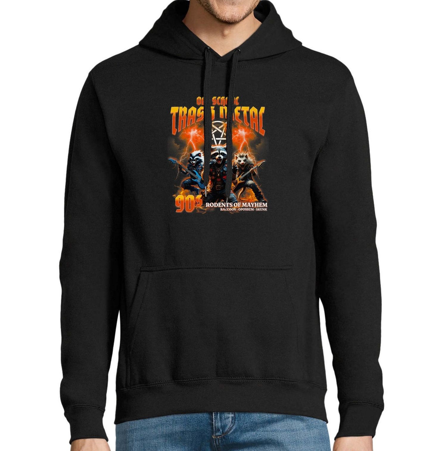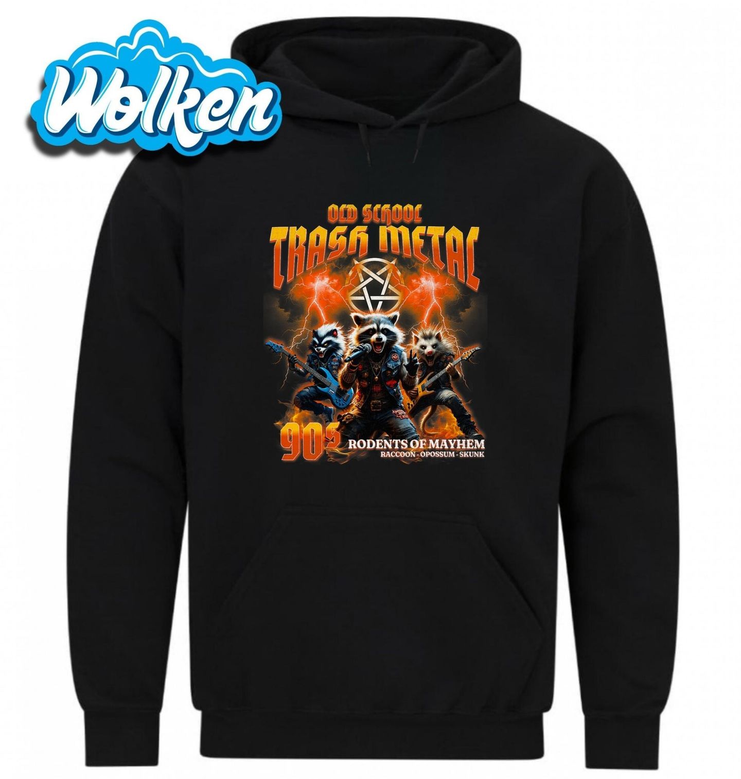 Pánská mikina Metalový Mýval 90's Rodents of Mayhem. Old School Trash Metal - Starý dobrý trash metal. Tento originální motiv přináší pořádnou dávku metalu, jak ho ještě neznáš – hlavními hvězdami jsou totiž mýval, vačice a skunk. Stylizovaní jako kapela „Rodents of Mayhem“, inspirovaní oldschoolovým metalem 90. let.