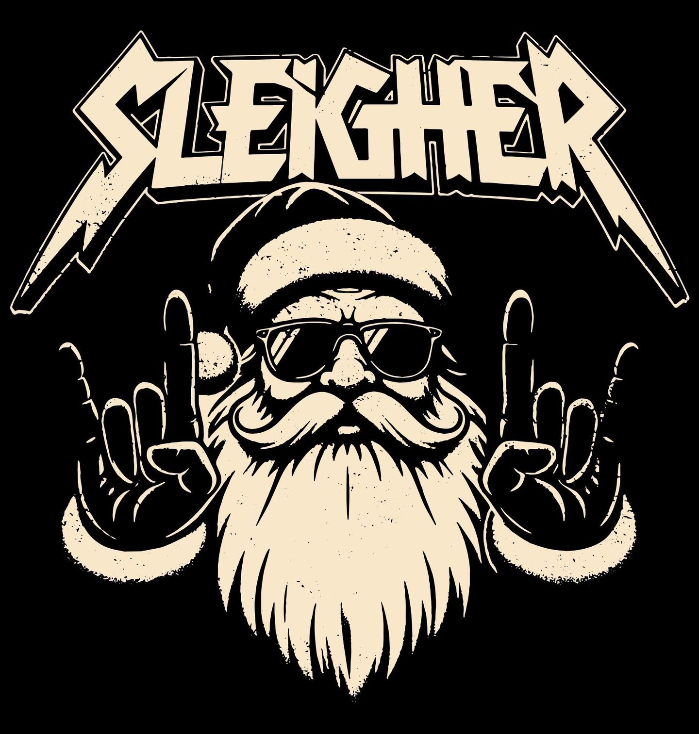 Pánské tričko Metalový Santa Sleigher. Připrav se na pořádně tvrdé Vánoce! Tohle není žádný obyčejný santa – tohle je SLEIGHER, metalová verze sváteční legendy. Stylový design s metalovým nápisem „SLEIGHER“ (slovní hříčka spojující „slayer“ (thrash metalová skupina) a „sleigh“ = sáně) ukazuje santu s brýlemi a metalovým gestem „devil horns“.