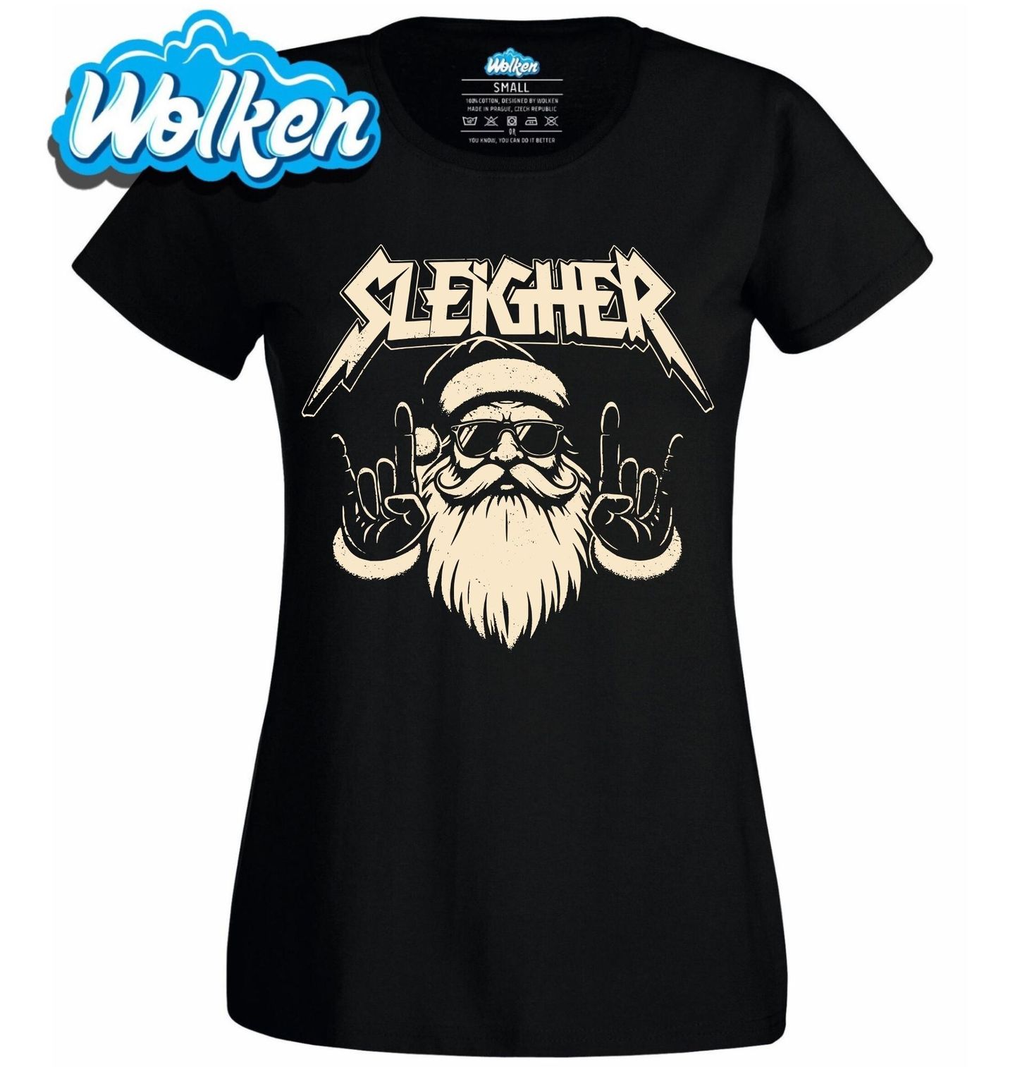 Dámské tričko Metalový Santa Sleigher. Připrav se na pořádně tvrdé Vánoce! Tohle není žádný obyčejný santa – tohle je SLEIGHER, metalová verze sváteční legendy. Stylový design s metalovým nápisem „SLEIGHER“ (slovní hříčka spojující „slayer“ (thrash metalová skupina) a „sleigh“ = sáně) ukazuje santu s brýlemi a metalovým gestem „devil horns“.