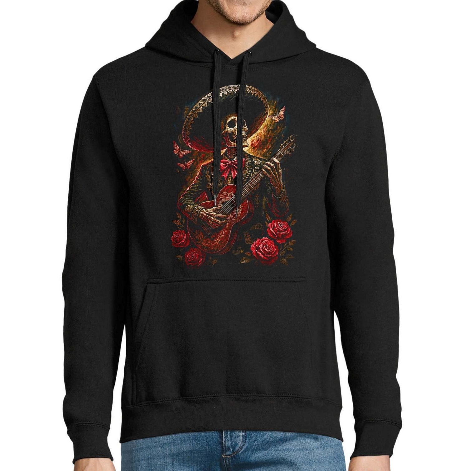 Pánská mikina Mexický Kostlivec se Sombrerem. Kostlivec v obleku charro a tradičním mariachi stylu hraje na klasickou (španělskou) kytaru. Kytara je klasická (španělská) kytara – typická pro mariachi. Mariachi je tradiční mexický hudební žánr a soubor, který vznikl v 18. a 19. století v západním Mexiku. Charakteristické je spojení houslí, trubek, kytary, vihuela a guitarrónu, často doprovázené procítěným zpěvem.