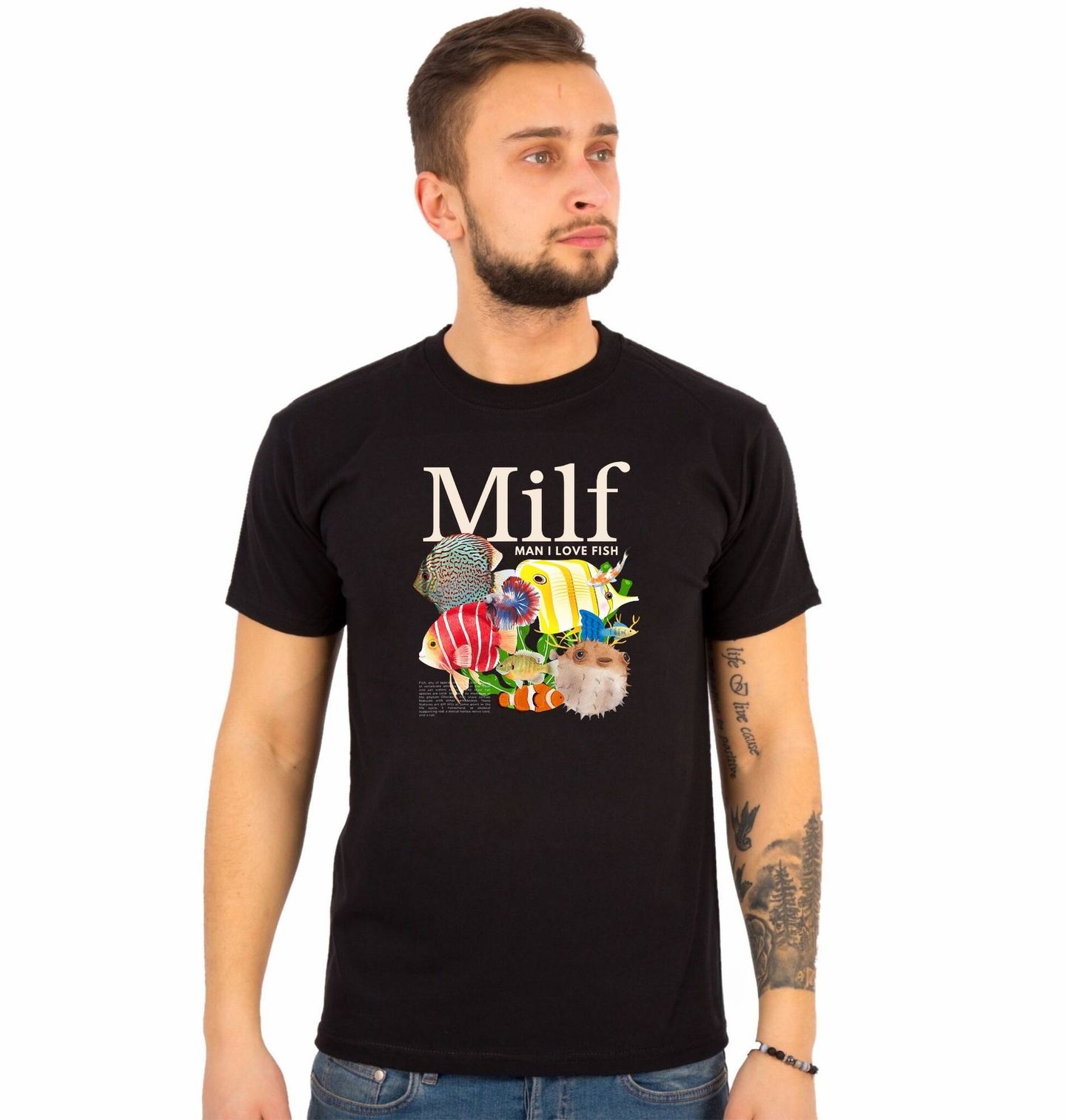 Pánské tričko MILF Man I Love Fish. Tento veselý a hravý motiv je ideální pro každého, komu učarovala ryba, podmořský svět a atmosféra, kterou přináší rybaření. Najdeš zde například terčovce (Discus), klauna očkatého (Nemo), bojovnici pestrou (Betta splendens), jehličnatku – ropušnici / puffer fish (nafukovací ryba) a také různé druhy mořských a akvarijních okrasných ryb.