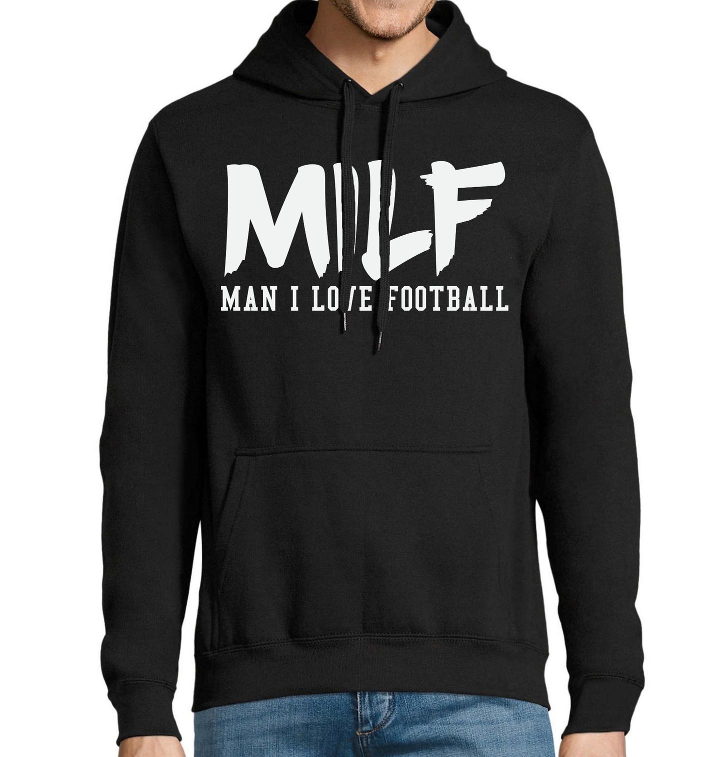 Pánská mikina MILF Miluji Fotbal. Tento vtipný design využívá známou zkratku MILF s novým významem „Man I Love Football“, tedy „Chlape, miluji fotbal“. Minimalistický styl a výrazná typografie dělají z motivu perfektní volbu pro fanoušky fotbalu, kteří mají smysl pro humor a chtějí dát svou sportovní vášeň jasně najevo.