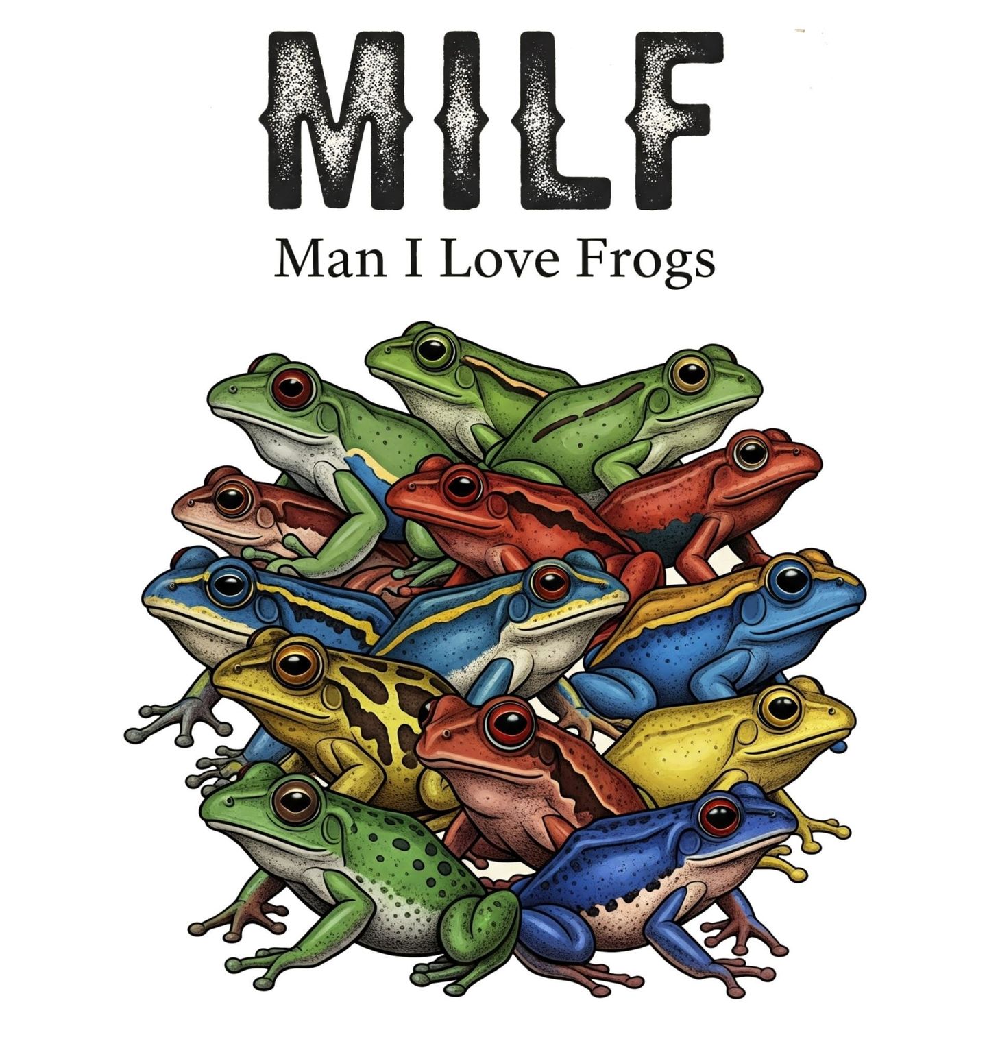Pánské tričko MILF Žabí Láska bez Hranic. Barevný motiv, kde každá žába hraje svou roli v hravé a originální kompozici plné života a nadsázky. Nápis „MILF – Man I Love Frogs“ znamená „Miluju žáby“ a dodává celému motivu vtipný a moderní nádech, který zaujme každého milovníka přírody i humoru.